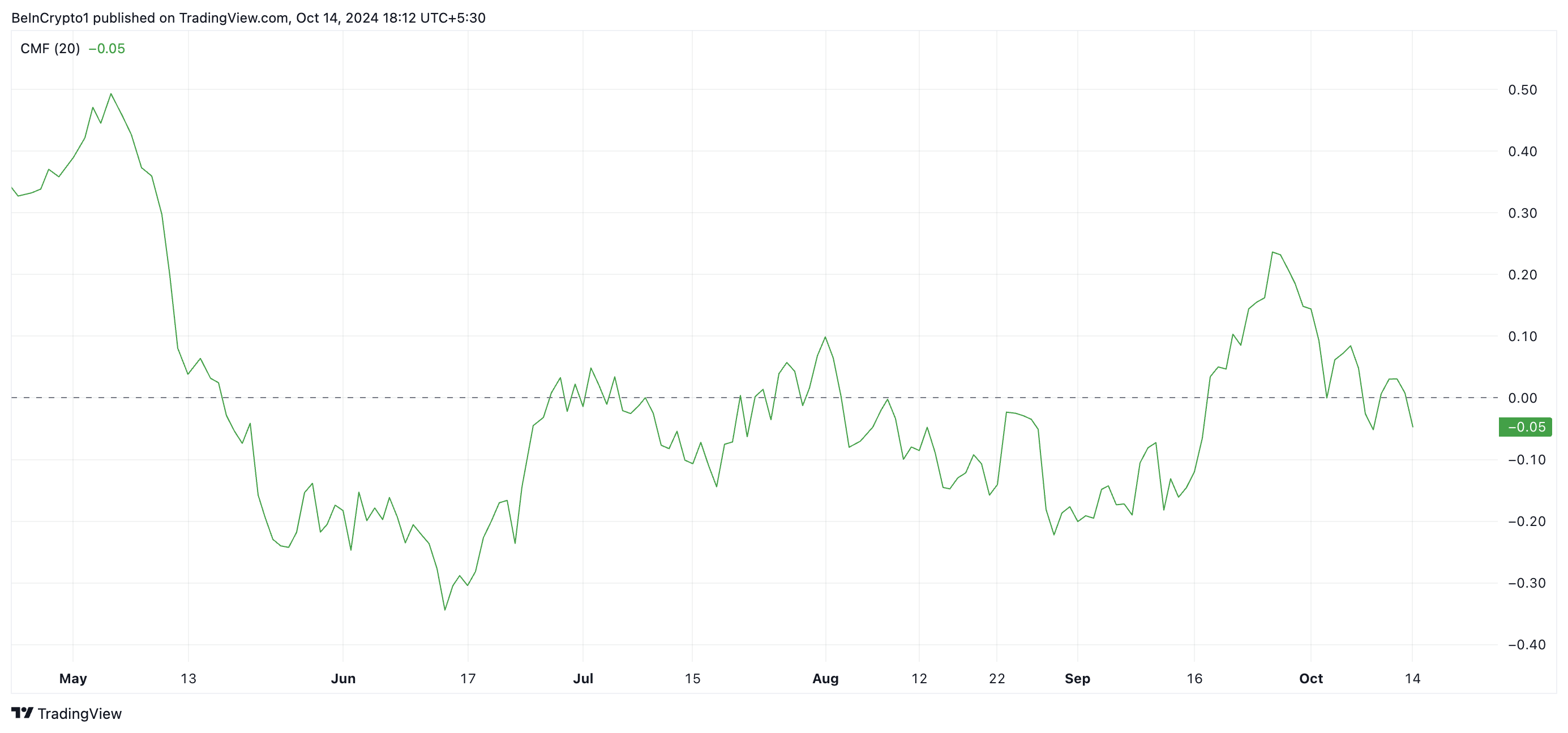 Der Chaikin Money Flow (CMF) von POPCAT ist seit Monatsbeginn stetig gesunken. Dies geschah trotz des Anstiegs des Memecoins, was eine bärische Divergenz erzeugt. Aktuell liegt der CMF unter null bei -0,05.