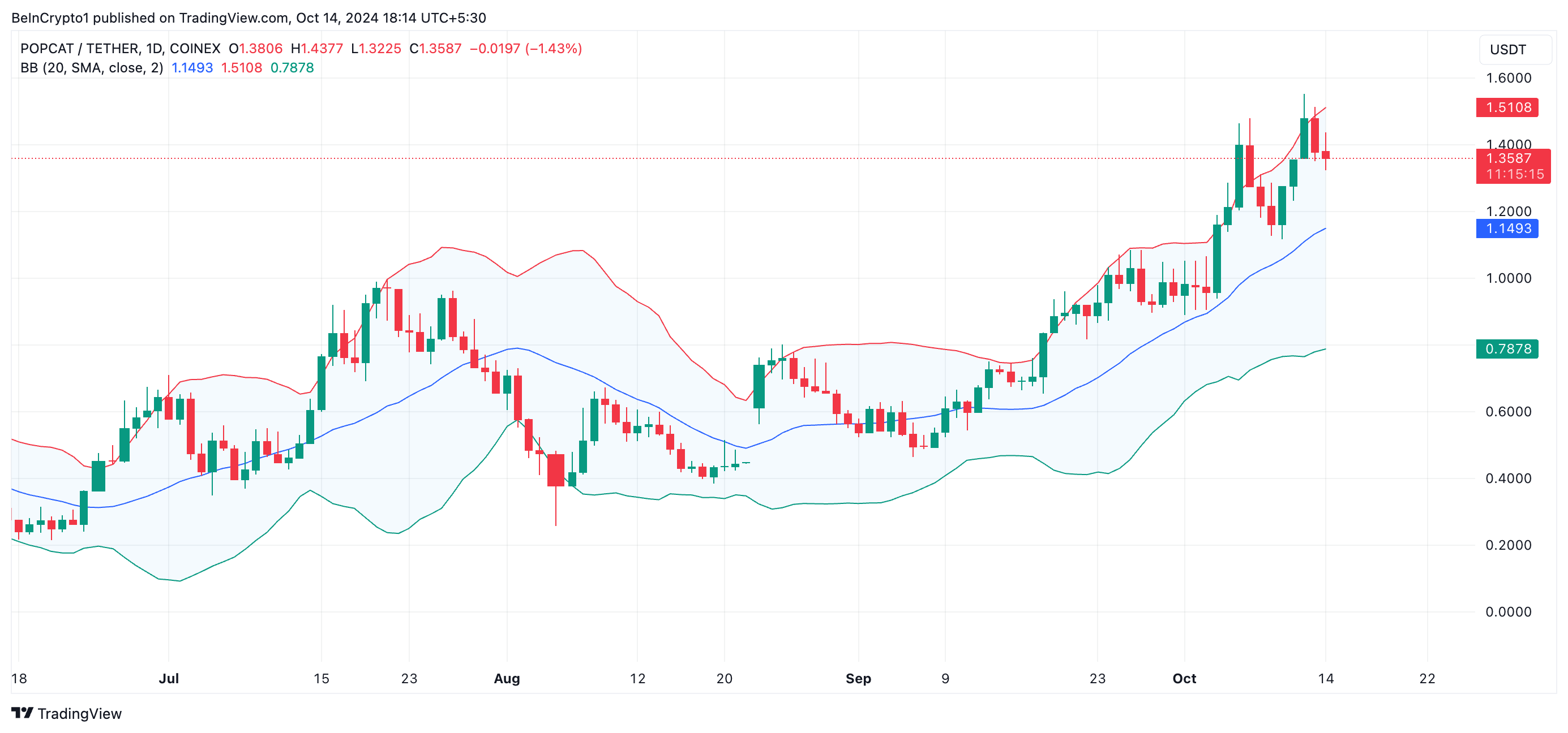 Wenn der Abstand zwischen den oberen und unteren Bändern dieses Indikators zunimmt, signalisiert dies erhöhte Marktschwankungen und die Möglichkeit bedeutender Kursänderungen. Zudem bewegte sich der Kurs von POPCAT während der Wochenendsitzungen kurzzeitig über das obere Band dieses Indikators.