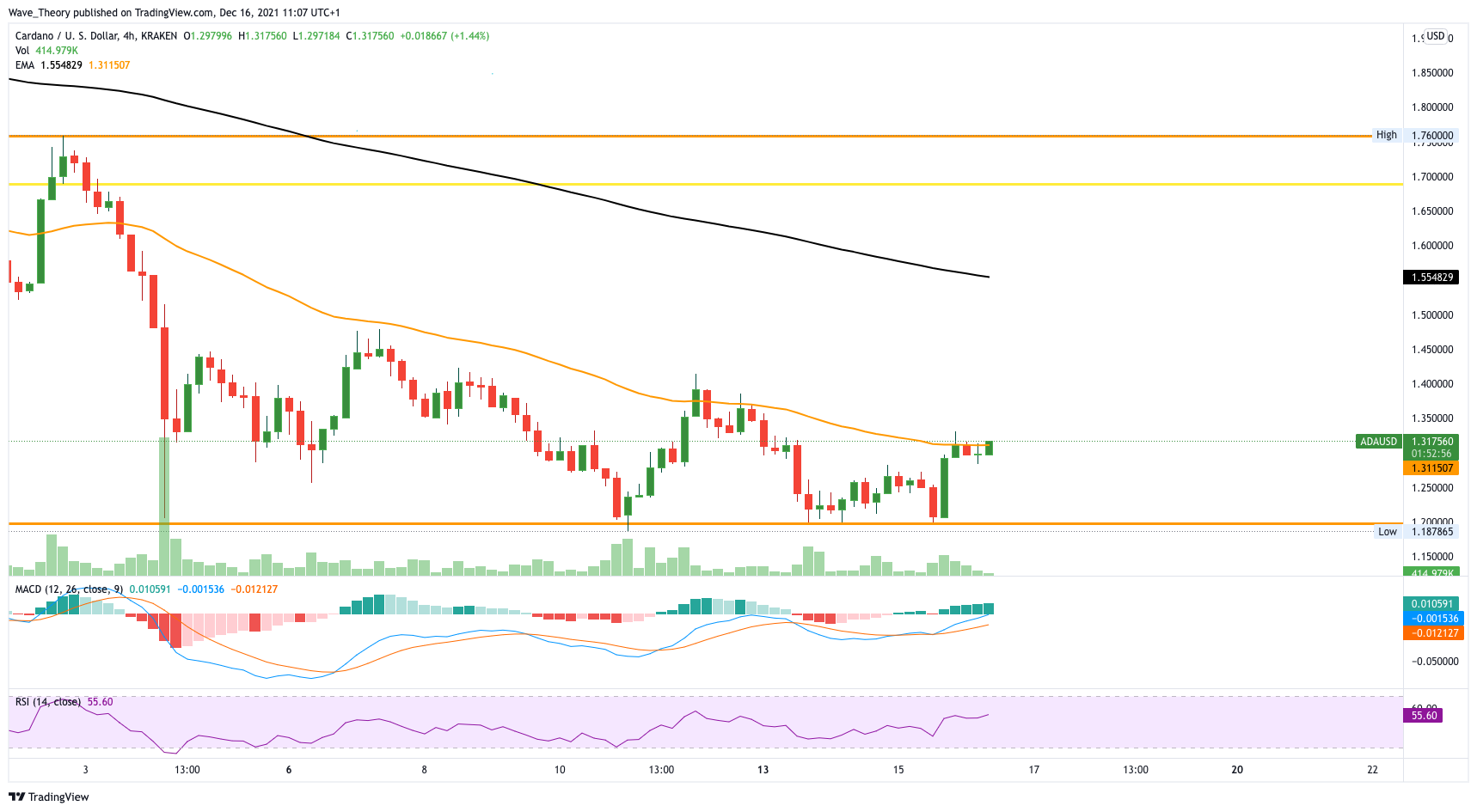 Im 4H-Chart kämpft der ADA Kurs mit dem 50-4H-EMA bei rund 1,3 USD. Sollte Cardano diesen überwinden, wäre dies der erste Schritt für eine Aufwärtsbewegung in Richtung 1,9 USD. Der MACD zeigt sich hier aktuell bullisch. Es gibt für Cardano aktuell bullische Chancen.