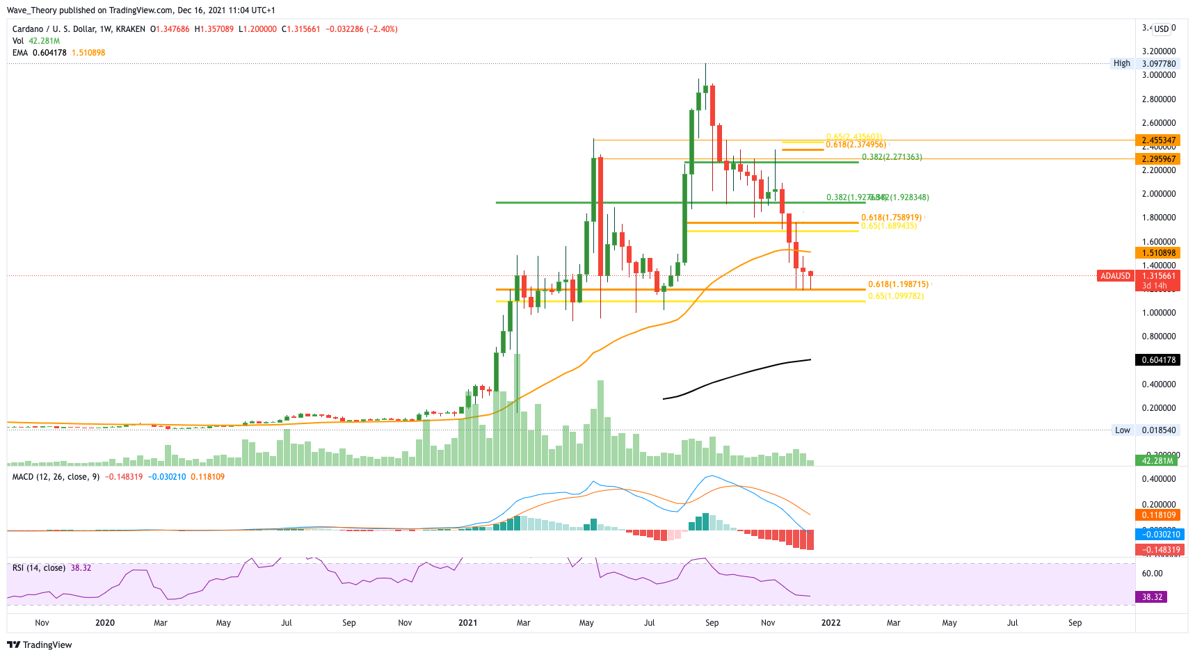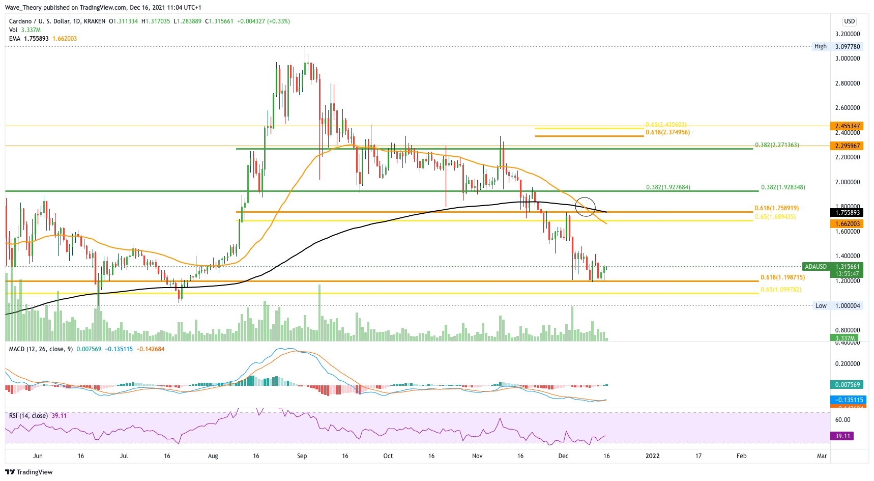 Im Tageskurs etablierte der ADA Kurs nun ein Death Cross, was den Trend mittelfristig bärisch bestätigt. Kurzfristig könnte Cardano aber jetzt nach oben steigen, denn Cardano befindet sich erneut an der Golden Ratio Unterstützung bei rund 1,2 USD und ist bisher noch nicht abgeprallt. Sollte Cardano jetzt abprallen, könnte der ADA Kurs bis 1,9 USD steigen.
