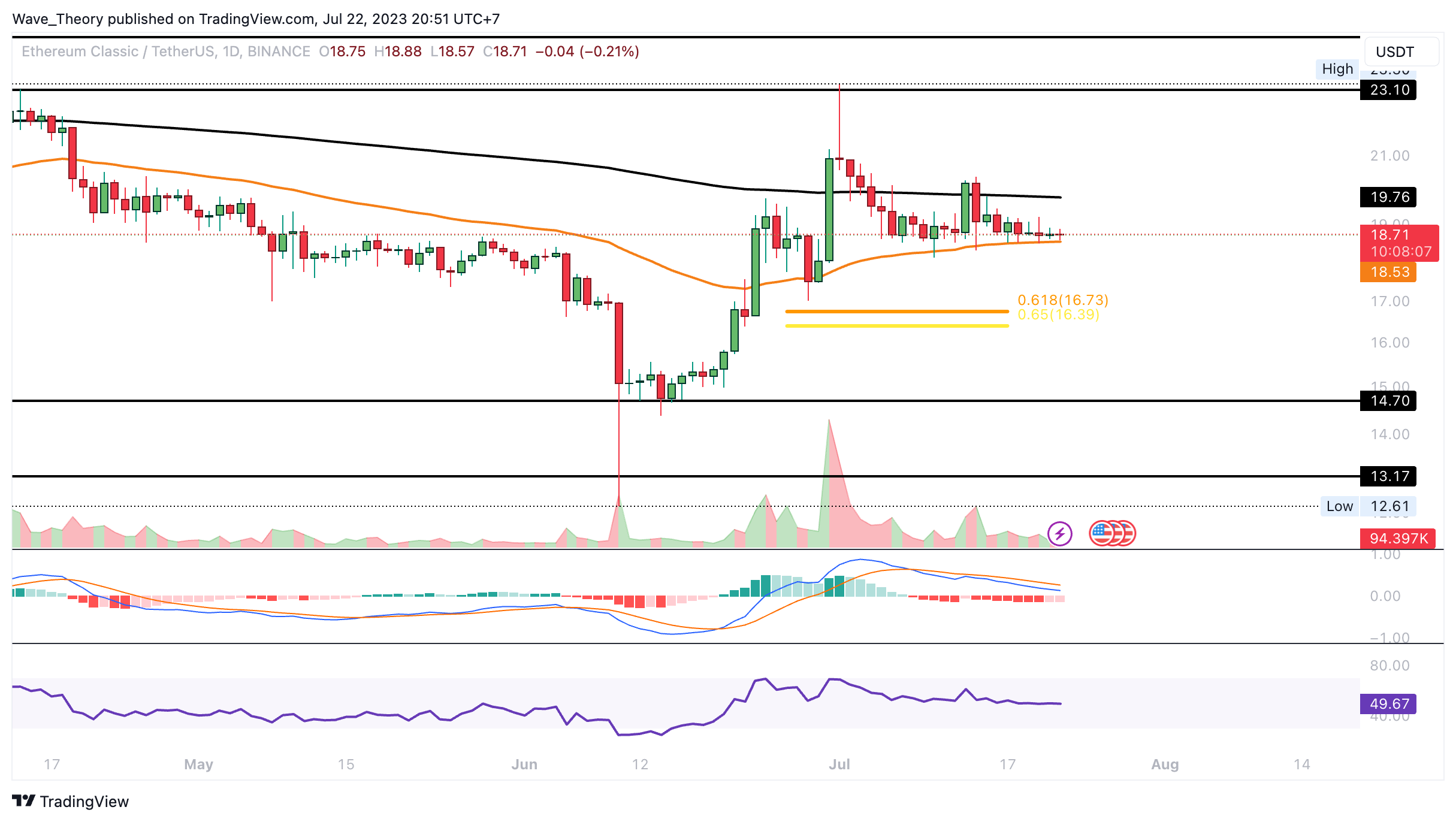 Der Ethereum Classic Kurs wurde vor einigen Tagen am horizontalen Widerstand zwischen rund 23 USD und 25 USD bärisch abgewiesen. Damit befindet sich der ETC Kurs jetzt am 50-Tage-EMA, welcher bei rund 18,5 USD als signifikante Unterstützung fungiert.