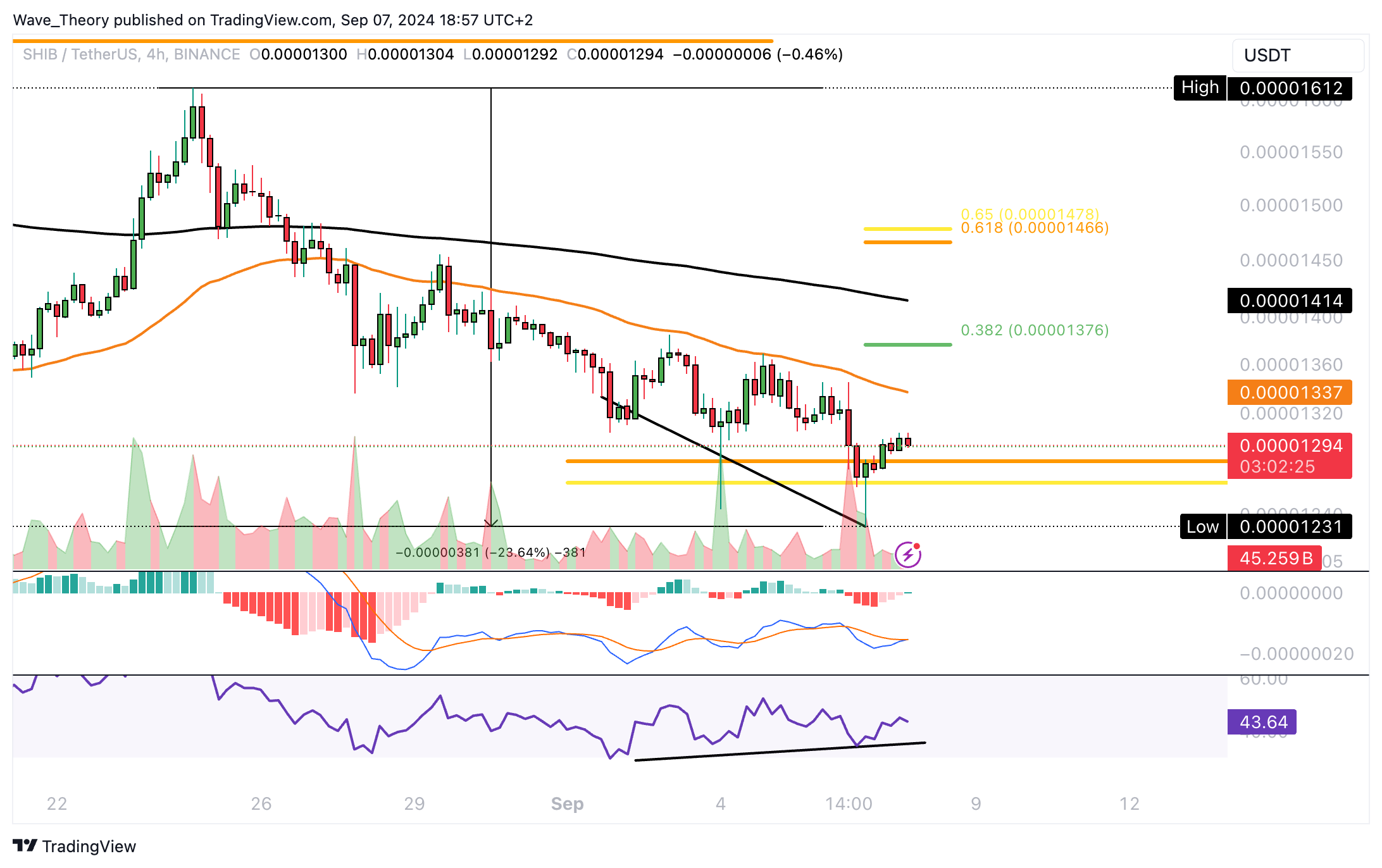 Im 4H-Chart zeichnet der RSI bereits eine bullische Divergenz ab, woraufhin der SHIB Kurs jetzt steigen könnte. Dabei warten bei rund 0,00001376 USD und bei rund 0,00001466 USD die nächsten signifikanten Fibonacci Widerstände.