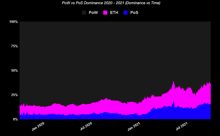Laut des StakingRewards Reports, hat sich die PoS- gegenüber der PoW-Dominanzrate innerhalb der letzten zwei Jahre mehr als verdoppelt – und das ohne Berücksichtigung von Ethereum.
