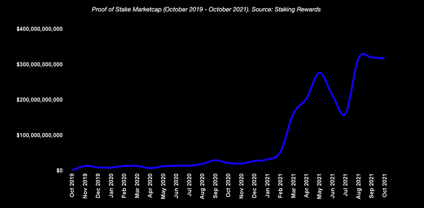 Laut StakingRewards Report liegt die Marktkapitalisierung von Proof of Stake (PoS) bei 326,775 Milliarden US-Dollar. Innerhalb des letzten Jahres ist das ein Anstieg von 21,117 Milliarden US-Dollar.
