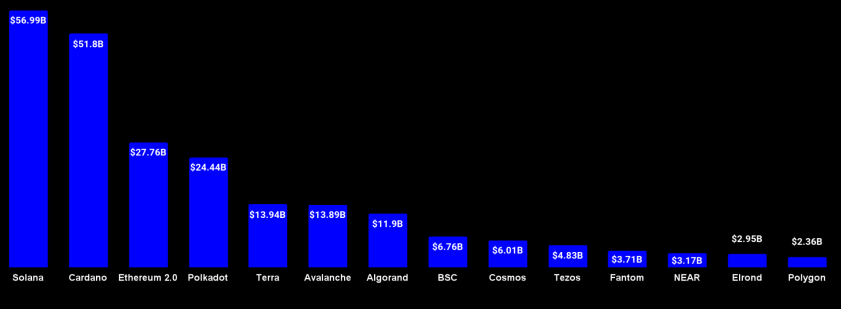 Und dabei liegt Solana als Staking Coin mit über 56 Trillionen US-Dollar gestakten Coins ganz weit vorne. Dicht gefolgt von Cardano mit gesetakten ADA in Wert von 51 Trillionen US-Dollar. Darauf folgen Ethereum 2.0, Polkadot, Terra, Avalanche, Algorand, BSC, Cosmos, Tezos, Fantom, NEAR, Elrond und Polygon.
