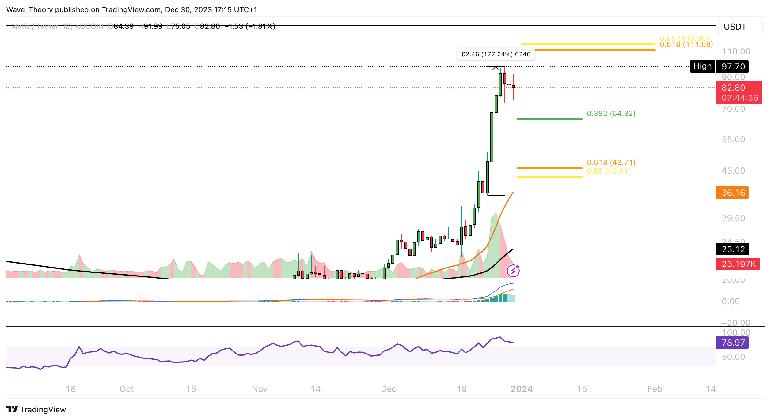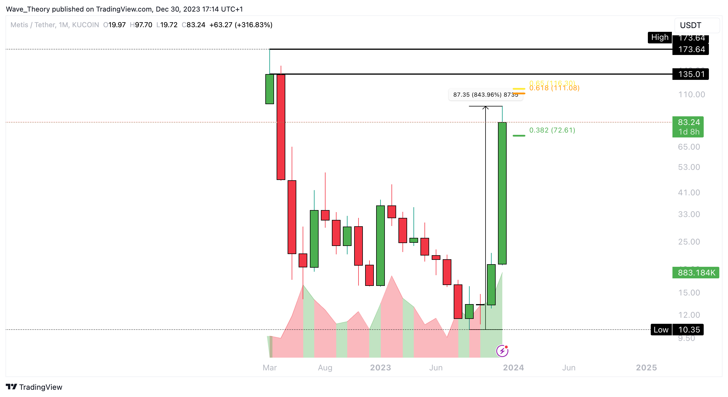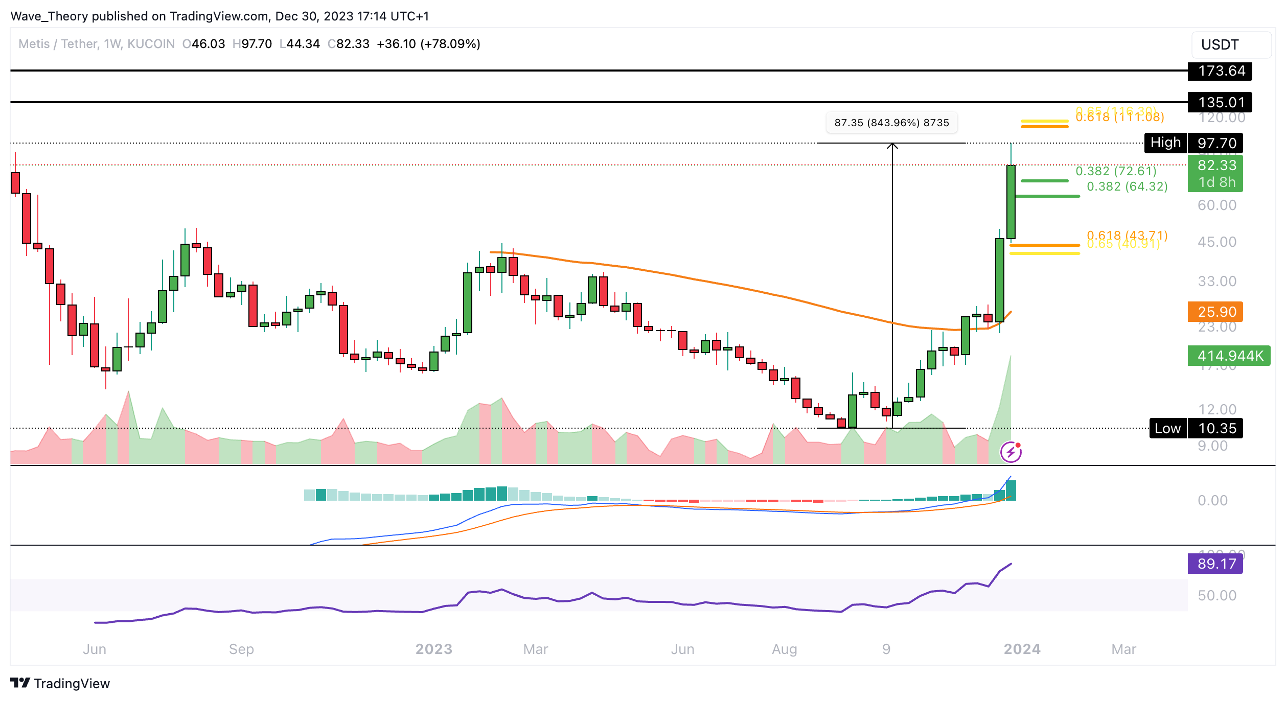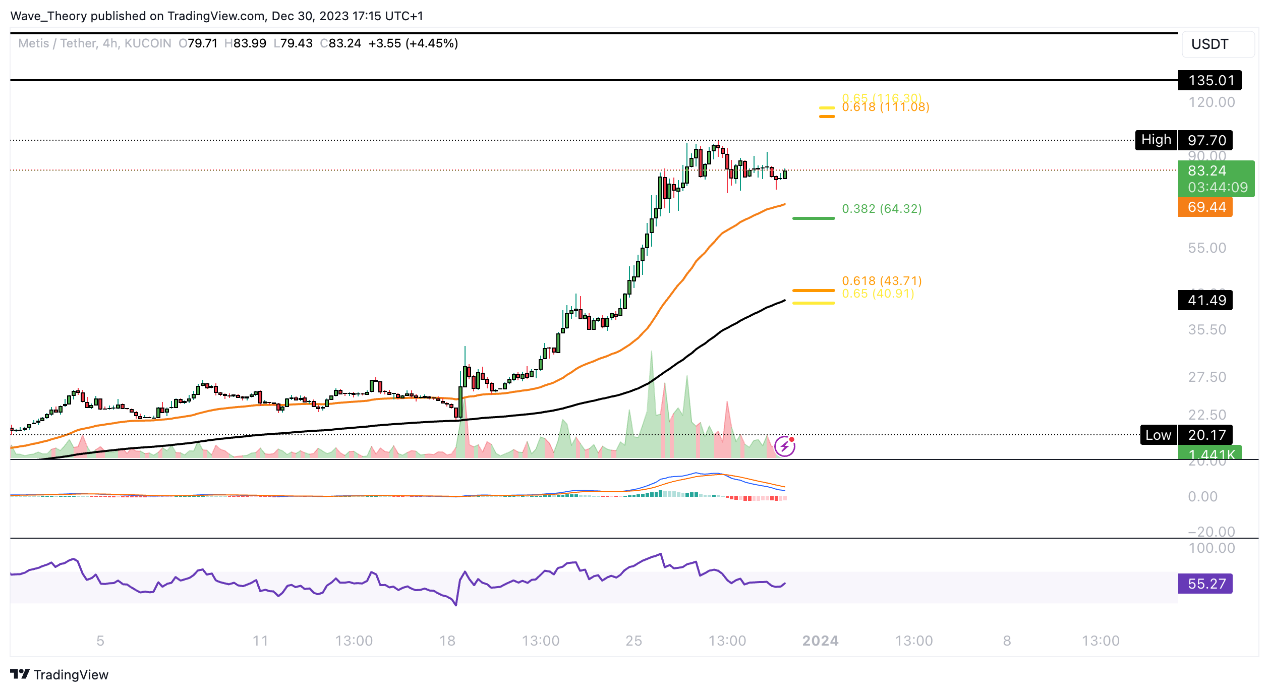 Bricht METIS den Golden Ratio Widerstand bei rund 112 USD, wartet zwischen rund 135 USD und 174 USD der nächste signifikante Widerstandsbereich.