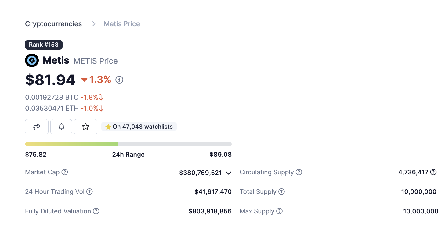 Es handelt sich dabei um einen Coin, der bereits auf vielen Börsen gelistet ist. Der Coin Metis (METIS) weist derzeit eine Marktkapitalisierung von rund 380 Millionen USD auf.