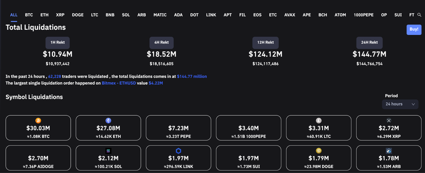 Als der Bitcoin Kurs unter die 28.000 US-Dollar Marke fiel, wurden über 144 Millionen US-Dollar liquidiert – in nur 24 Stunden. Laut den Daten der Krypto-Analysefirma Coinglass verloren dabei Pepe-Trader:innen rund 7,32 Millionen US-Dollar.