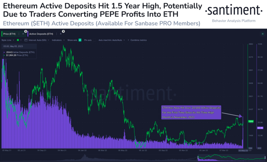 Darüber hinaus berichtet Santiment, dass die Zahl der ETH-Einlagen vor kurzem das höchste Niveau seit November 2021 erreicht hat. Analyst:innen der die Krypto-Analysefirma zufolge ist dieser Anstieg auf PEPE-Trader:innen zurückzuführen, die ihre Profite in Ethereum umwandeln.