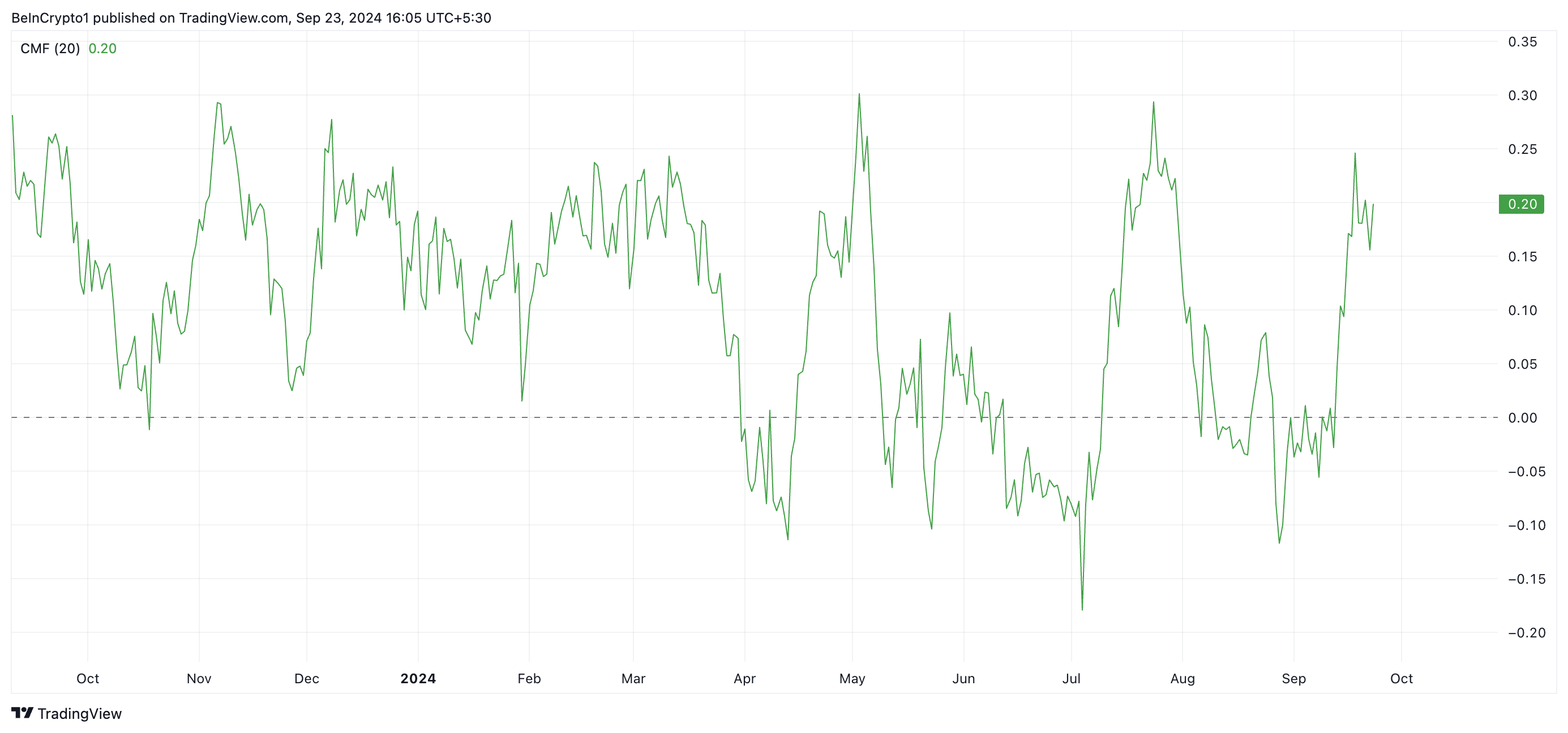 Unterstützt wird diese Perspektive durch den Chaikin Money Flow (CMF) von Ripple, der derzeit bei 0,20 liegt. Eine hohe Tokenakkumulation liegt vor, wenn der CMF eines Assets über Null liegt. Dies ist ein bullisches Signal für Ripple, da es eine positive Marktstimmung widerspiegelt und darauf hinweist, dass der Kurs weiter steigen wird.