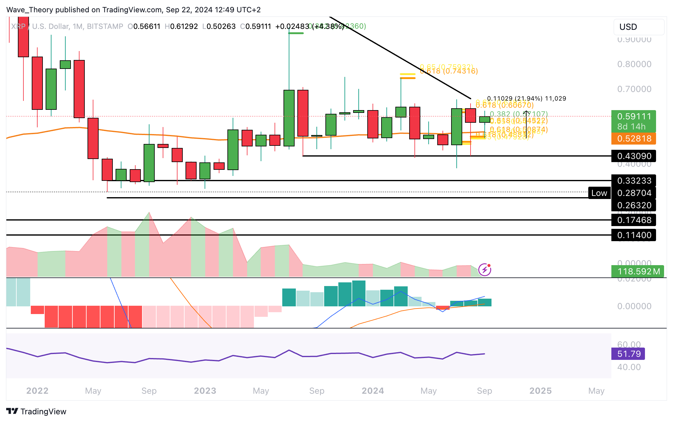 Der 50-Monate-EMA fungiert dabei bei rund 0,528 USD als signifikante Unterstützung. In den letzten zwei Monaten konnte sich Ripple erfolgreich darüber halten.