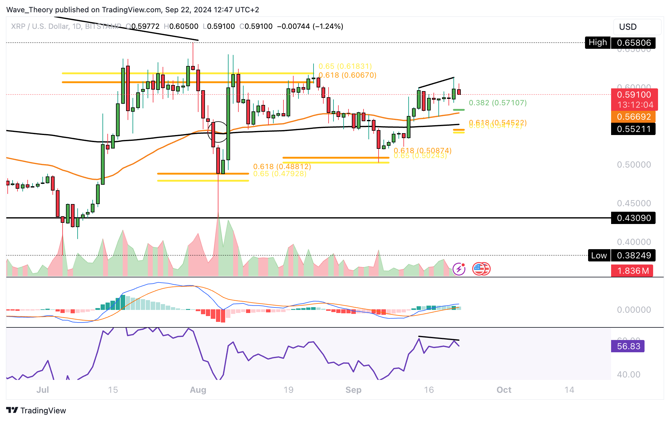 Der Ripple Kurs konnte zunächst an der Golden Ratio bei rund 0,5 USD abprallen. Seither ist der Kurs auf rund 0,6 USD gestiegen.