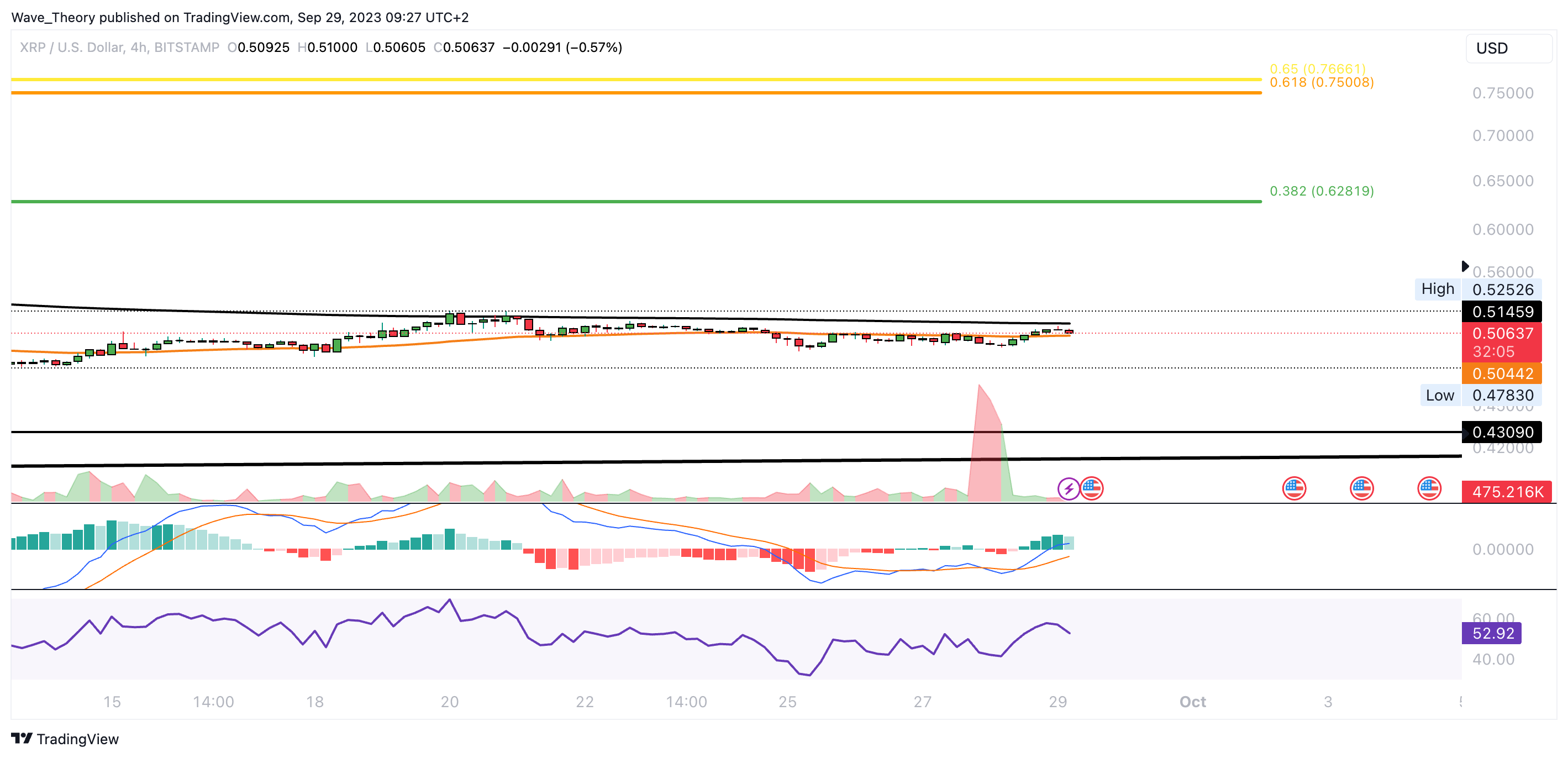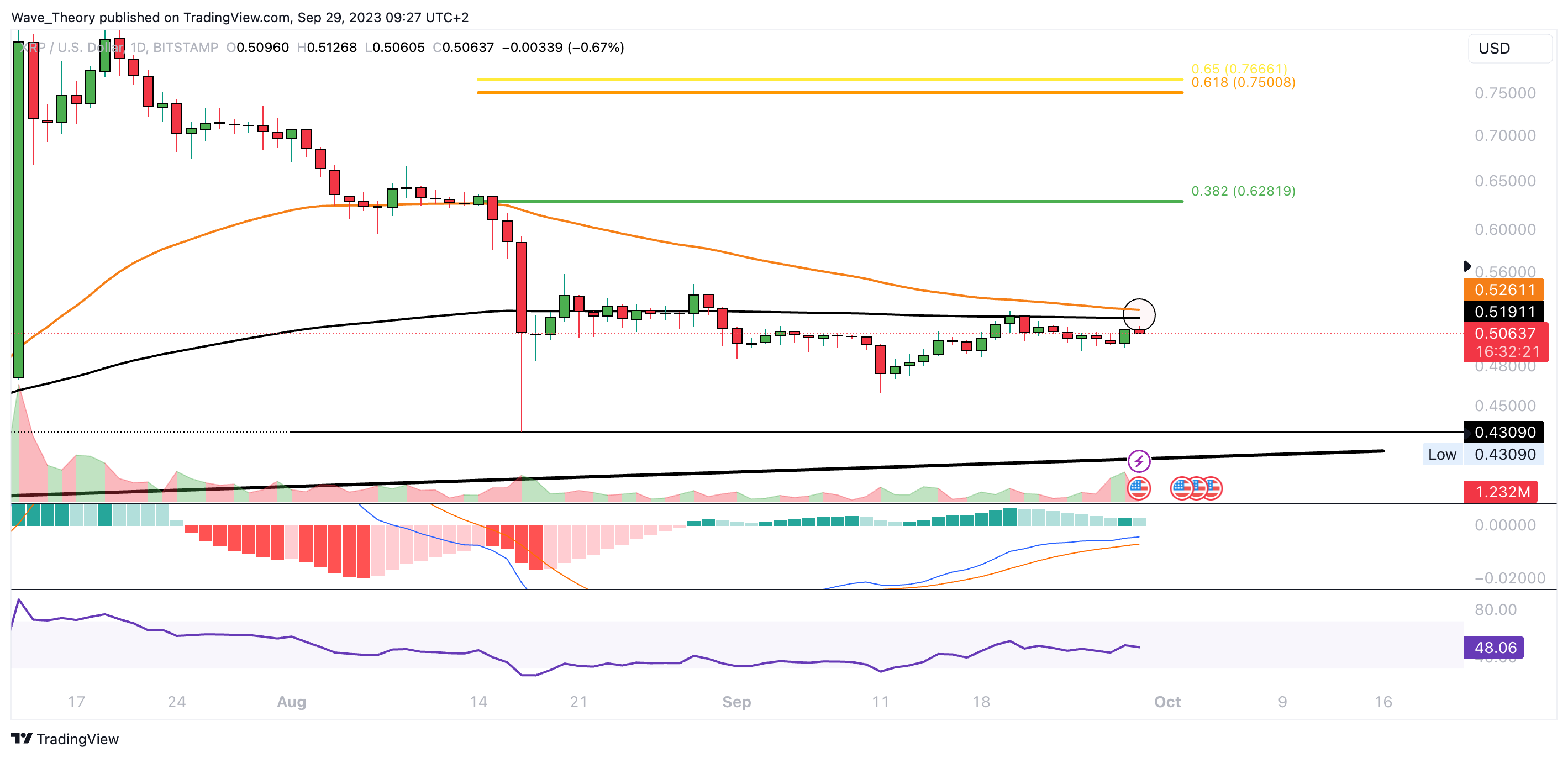 Im 4H-Chart etablierte sich bereits ein Death Cross, womit der Trend kurzfristig bärisch bestätigt ist. Die MACD Linien sind hingegen bullisch überkreuzt und der RSI bewegt sich in neutralem Territorium. Das Histogramm des MACDs tickt derzeit aber bärisch tiefer. Sollte XRP den Abwärtstrend fortsetzen, wartet spätestens bei rund 0,43 USD signifikante Unterstützung.