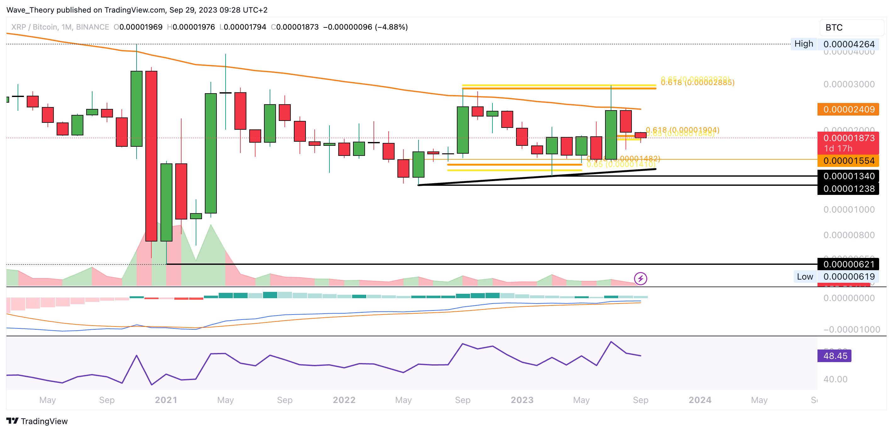 Der RSI bewegt sich dabei in neutralem Territorium und gibt keine eindeutigen Signale. Wenn der XRP Kurs die Golden Ratio Unterstützung bei rund 0,000019 BTC bärisch bricht, stößt er bei rund 0,0000145 BTC auf die nächste signifikante Unterstützung.