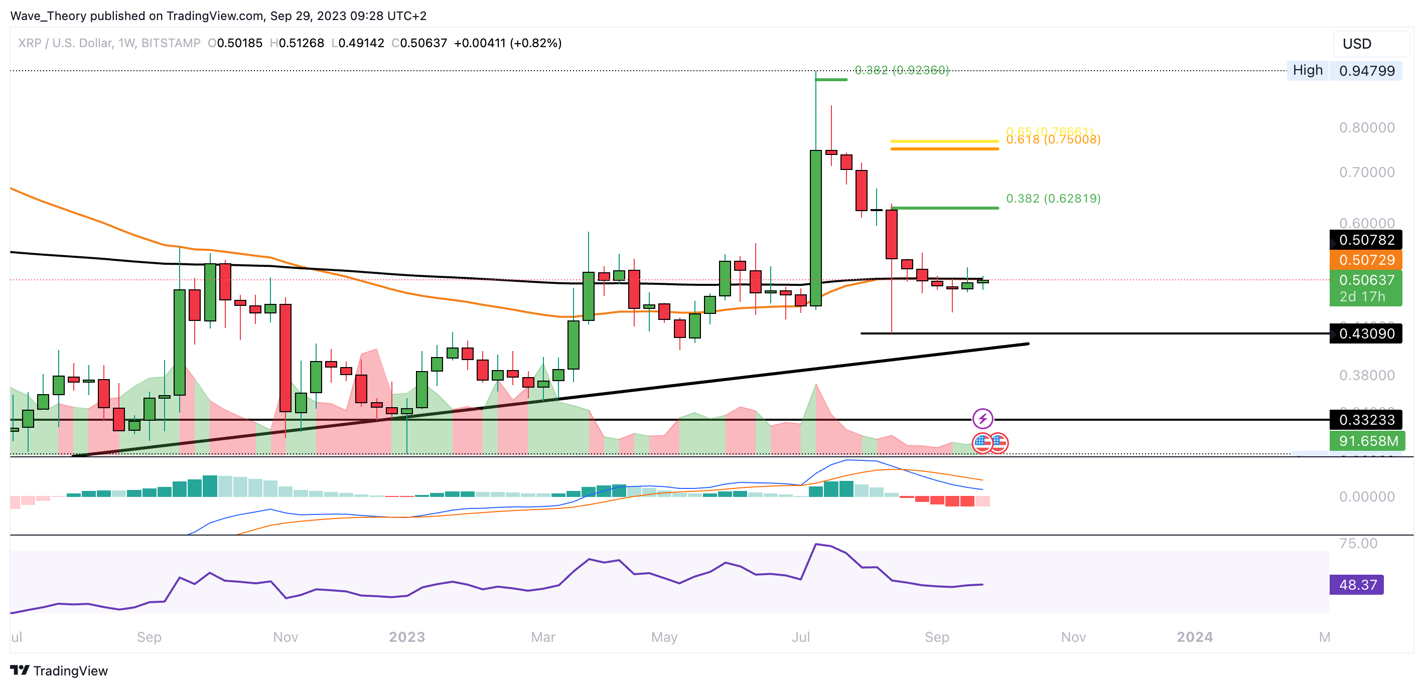 Sollte XRP die Unterstützung hingegen bärisch brechen, wartet bei rund 0,43 USD die nächste Unterstützung. Bricht XRP auch diese Unterstützung, wartet erst wieder zwischen rund 0,287 USD und 0,33 USD eine signifikante Unterstützungszone.