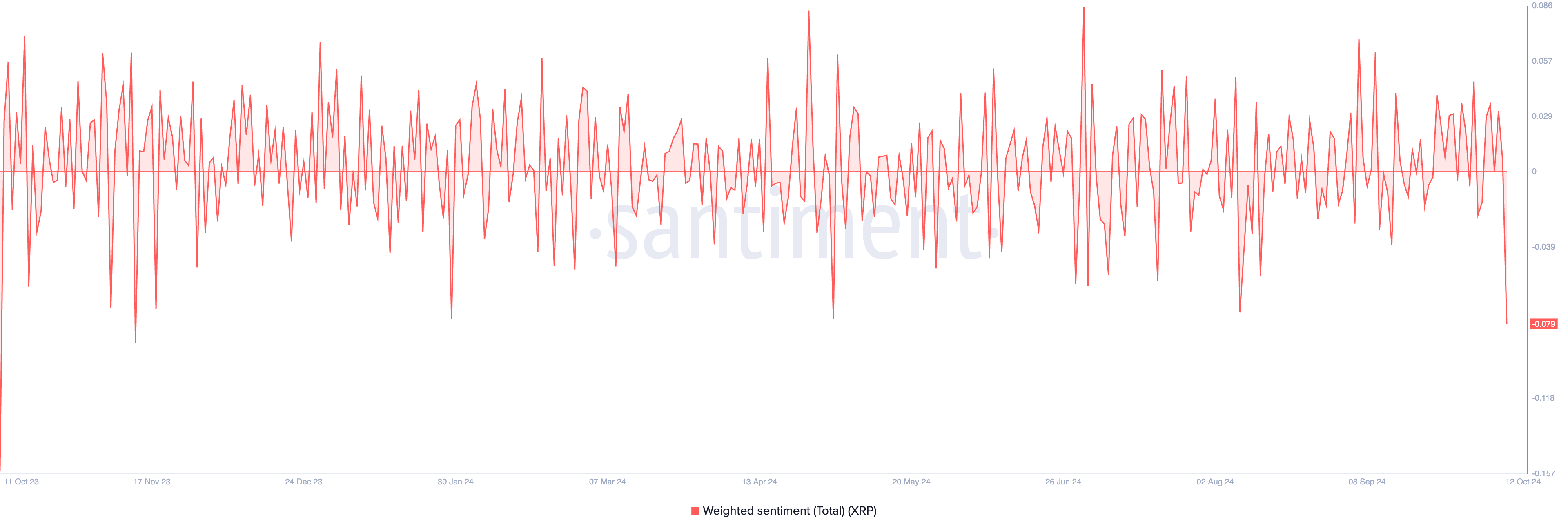 Darüber hinaus spiegelt das gewichtete Sentiment von XRP die negative Tendenz des Marktes gegenüber dem Altcoin wider. Dieser Indikator, der die allgemeine Marktstimmung misst, liegt derzeit bei -0,07.