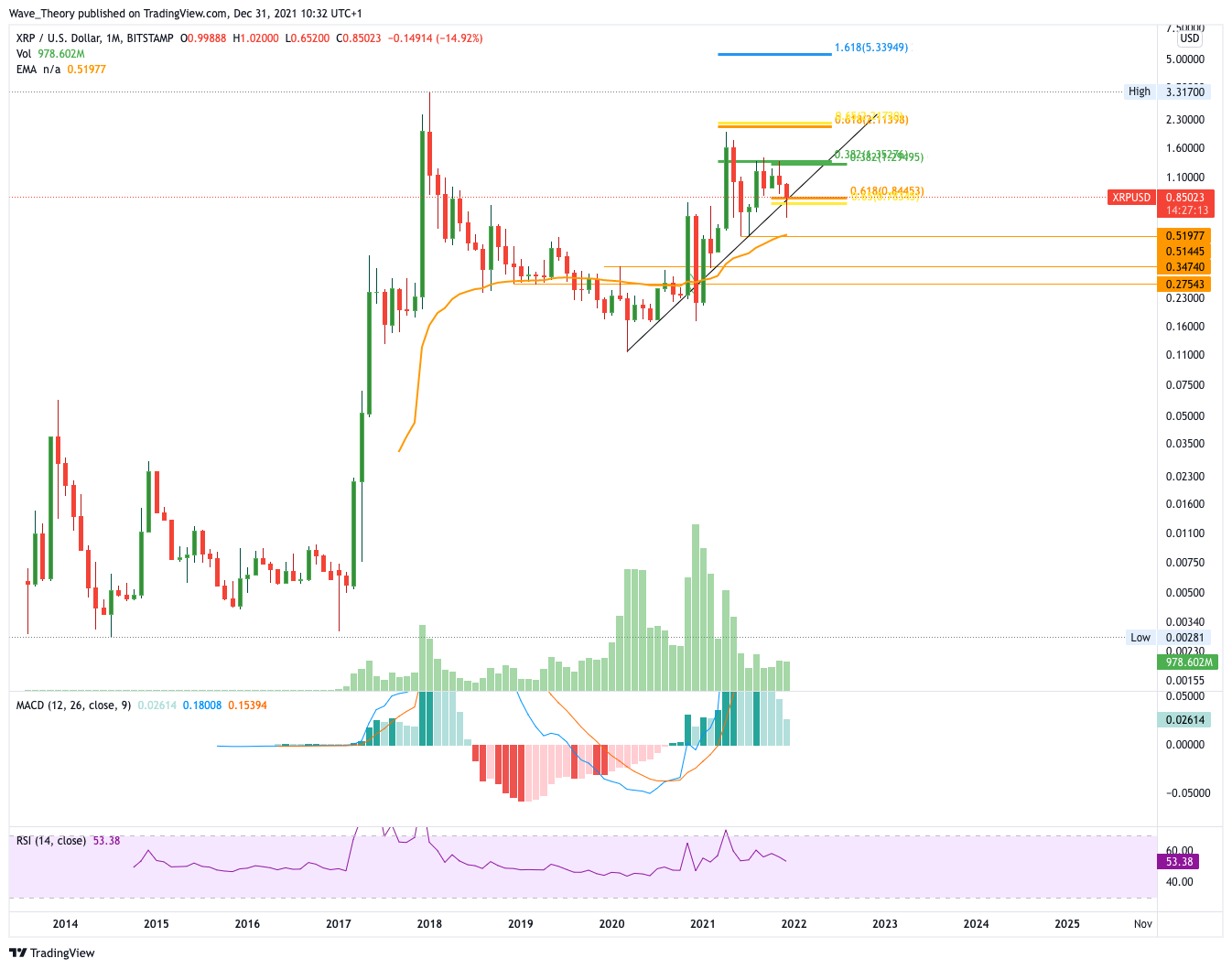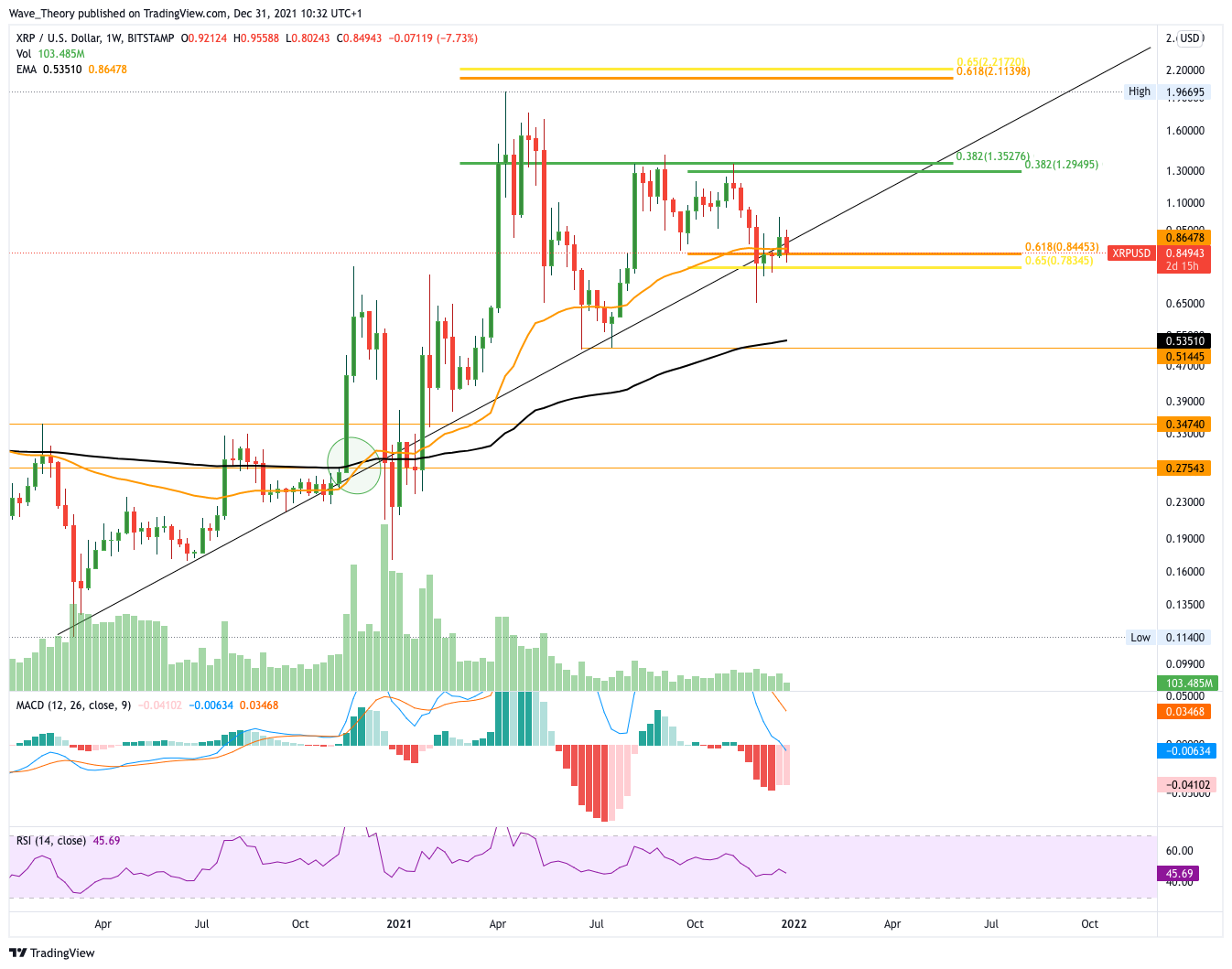 Sollte die Golden Ratio Unterstützung nicht halten, findet Ripple bei rund 0,5 USD erneut starke Unterstützung. Dort eilt zusätzlich der 50-Wochen-EMA zur Hilfe. Das Histogramm des MACDs tickt die letzten zwei Wochen bullisch nach oben. Wenn die Golden Ratio Unterstützung nicht bärisch durchbrochen wird, könnte der XRP Kurs bis rund 1,3 USD steigen, denn dort trifft Ripple auf den 0,382 Fib Widerstand.