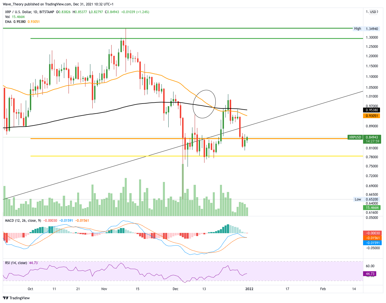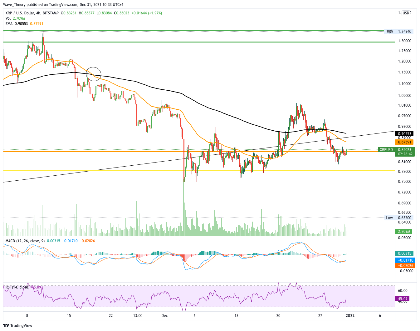 Auch im 4H-Chart ist das Death Cross der EMAs intakt. Hier zeigt sich der MACD aber bullisch und auch der RSI erreichte erst vor kurzem überverkaufte Regionen. XRP könnte bis rund 1,3 USD steigen wenn er nun stark an der Golden Ratio bei 0,85 USD abprallt.