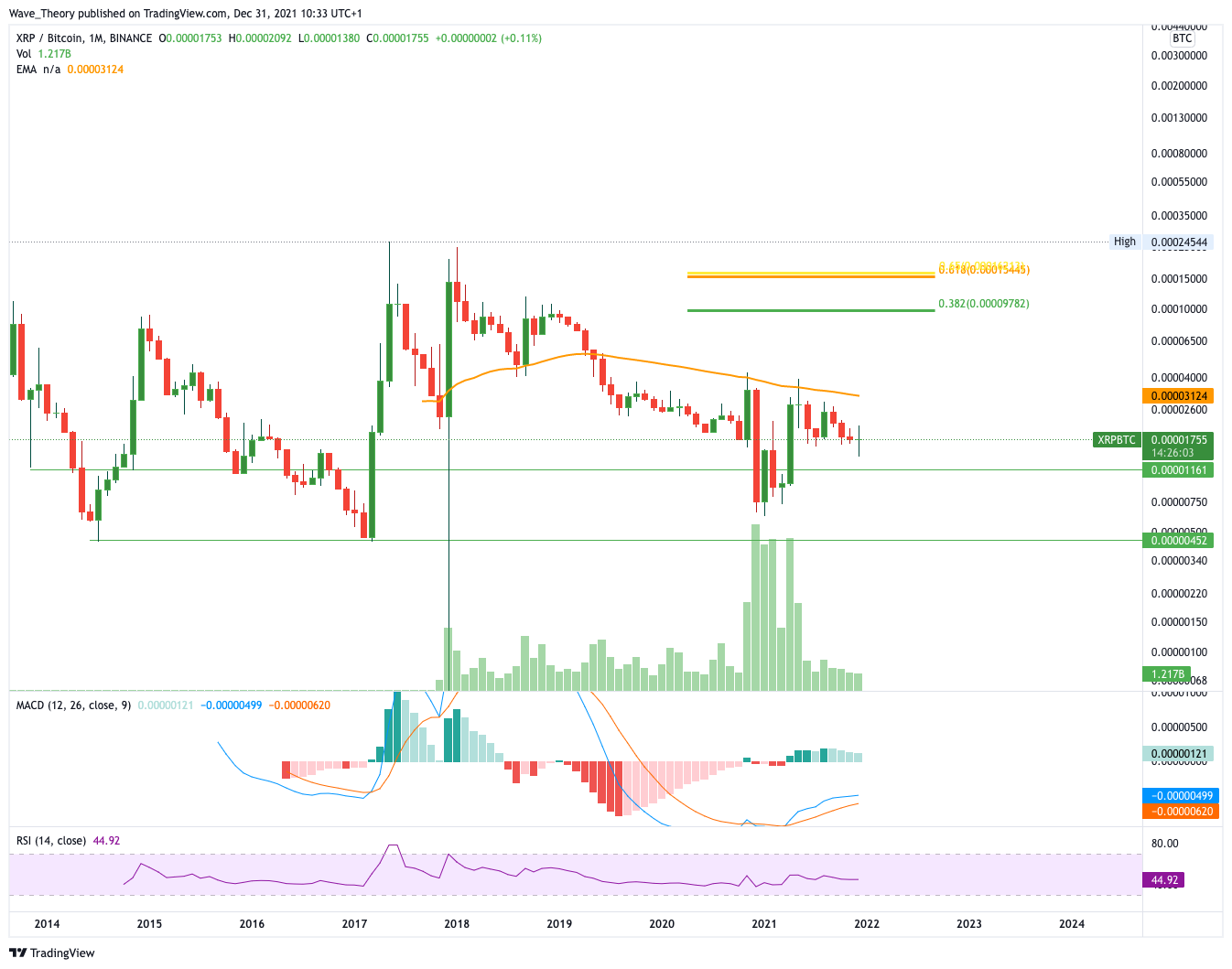 Gegen Bitcoin prallte XRP sehr stark an der horizontalen Unterstützung zwischen 0,0000045 – 0,000012 BTC ab. Daraufhin wurde Ripple aber am 50-Monate-EMA bei rund 0,000031 BTC abgewiesen. Sollte XRP diesen Widerstand brechen, könnte er bis 0,000098 BTC oder gar 0,00015 BTC steigen. Der MACD zeigt sich aber eher bärisch und sollte XRP erneut am 50-Monate-EMA scheitern, wird er womöglich zur horizontalen Unterstützung zurückkehren.