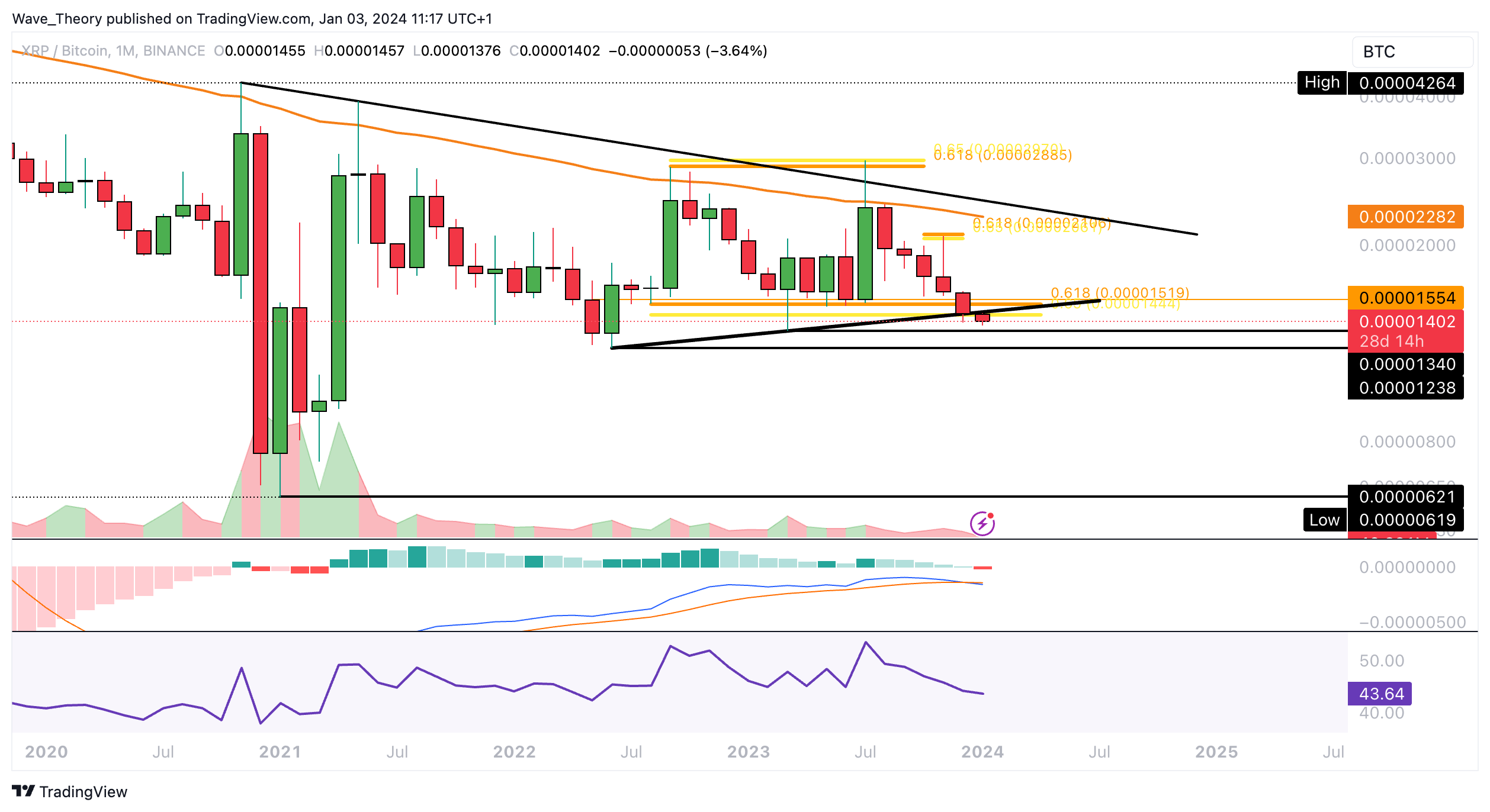Gegen Bitcoin könnte der XRP Kurs die Golden Ratio Unterstützung bei rund 0,0000155 BTC jetzt bärisch brechen, um zur Unterstützungszone zwischen rund 0,0000124 BTC und 0,0000134 BTC zurückzukehren.