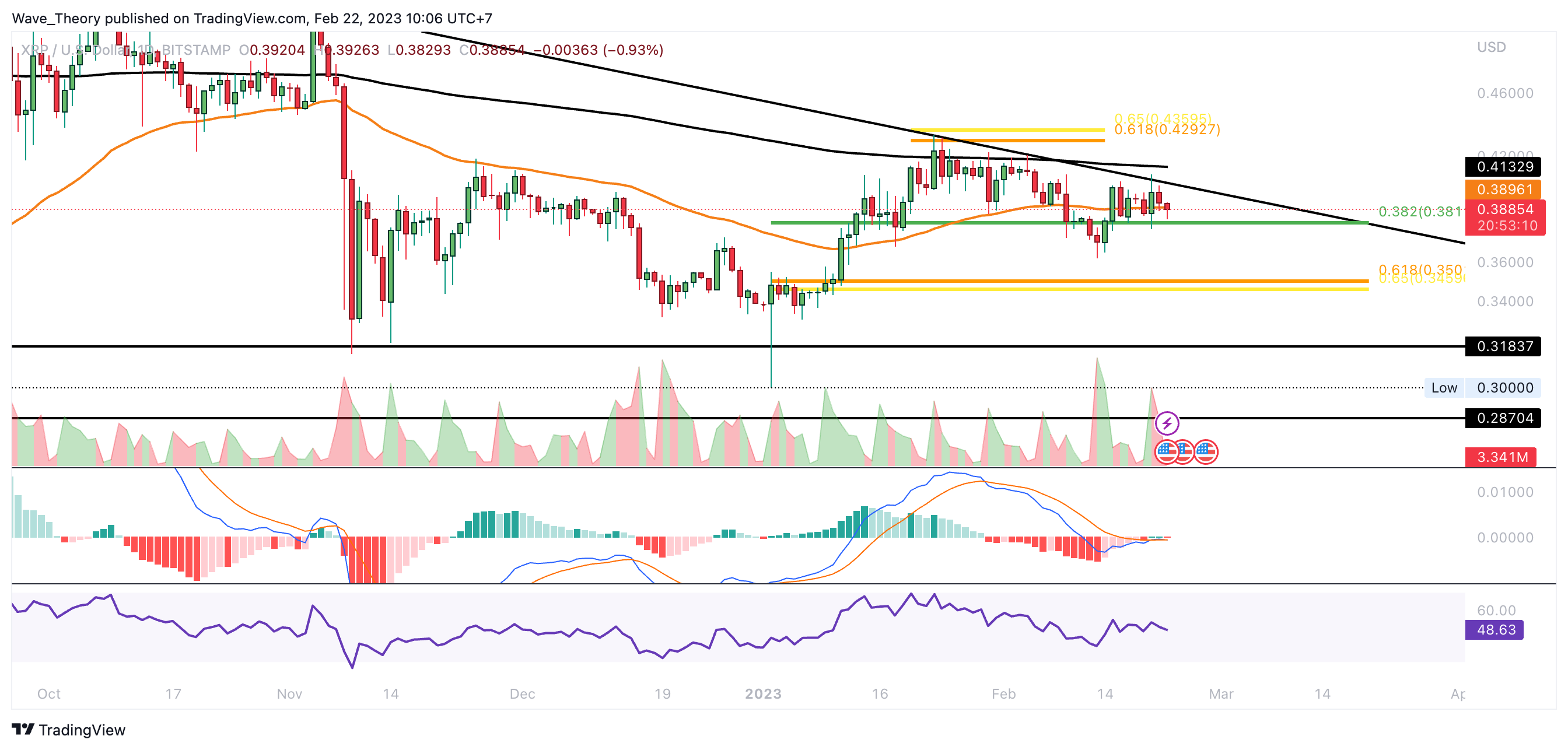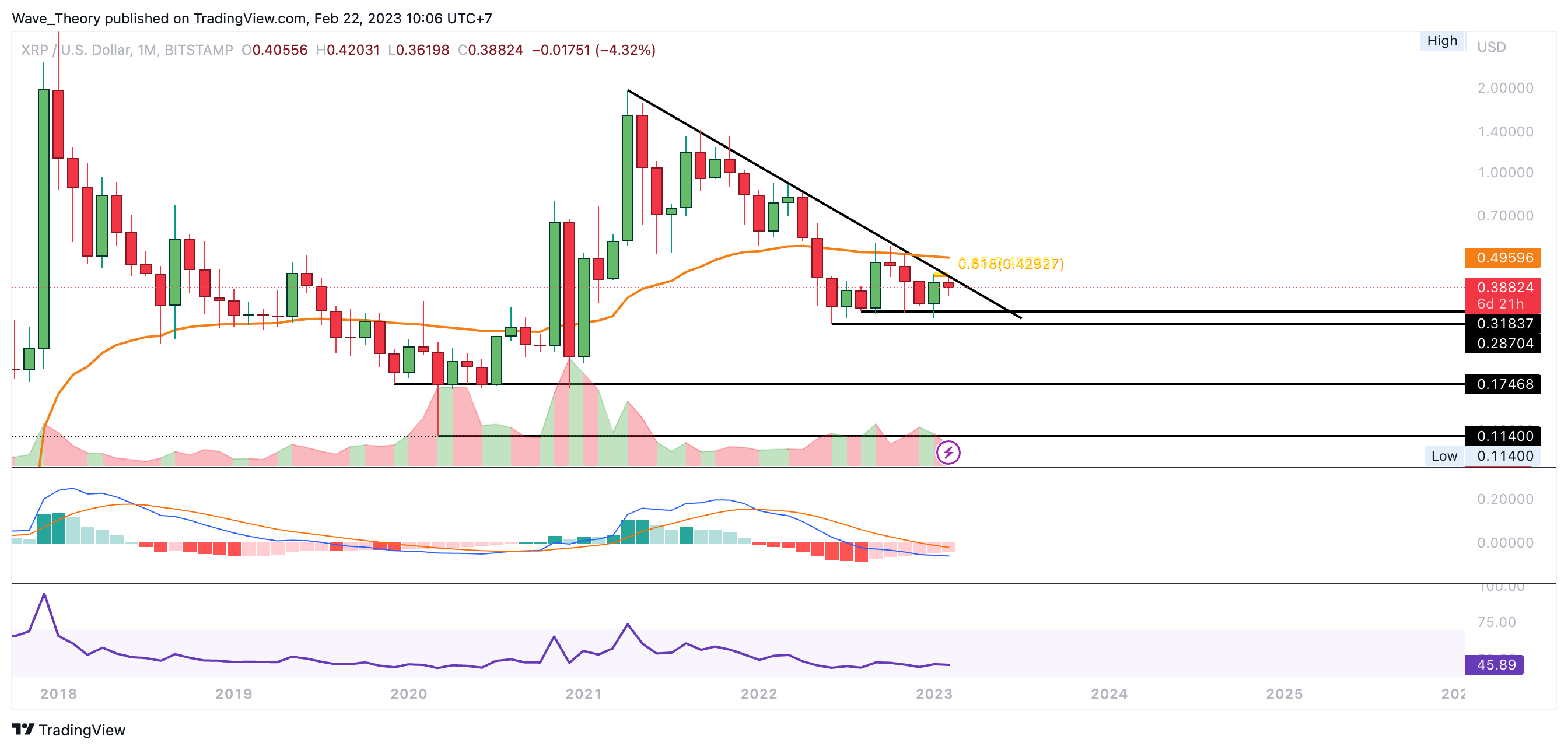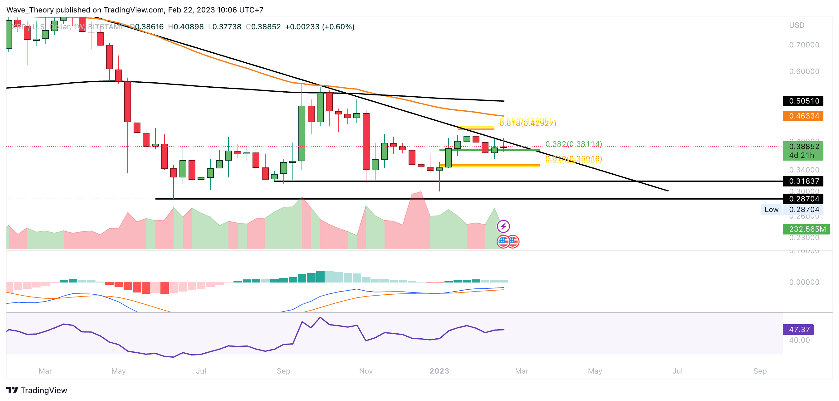 Sofern Ripple die Golden Ratio bei rund 0,43 USD nicht bullisch bricht, wird XRP womöglich den Bärentrend fortsetzen. Dabei wartet spätestens zwischen rund 0,287 USD und rund 0,32 USD signifikante Unterstützung auf den XRP Kurs.