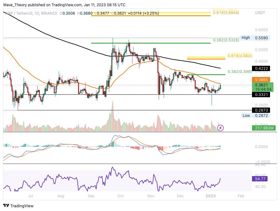 Sollte Ripple diesen Widerstand brechen, wartet bei rund 0,399 USD der nächste signifikante Fib Widerstand. Danach wartet dann an der Golden Ratio bei rund 0,46 USD signifikanter Widerstand. Darüber hinaus sind die MACD Linien im Tageschart bullisch überkreuzt und das Histogramm des MACDs tickt seit Tagen bullisch höher.