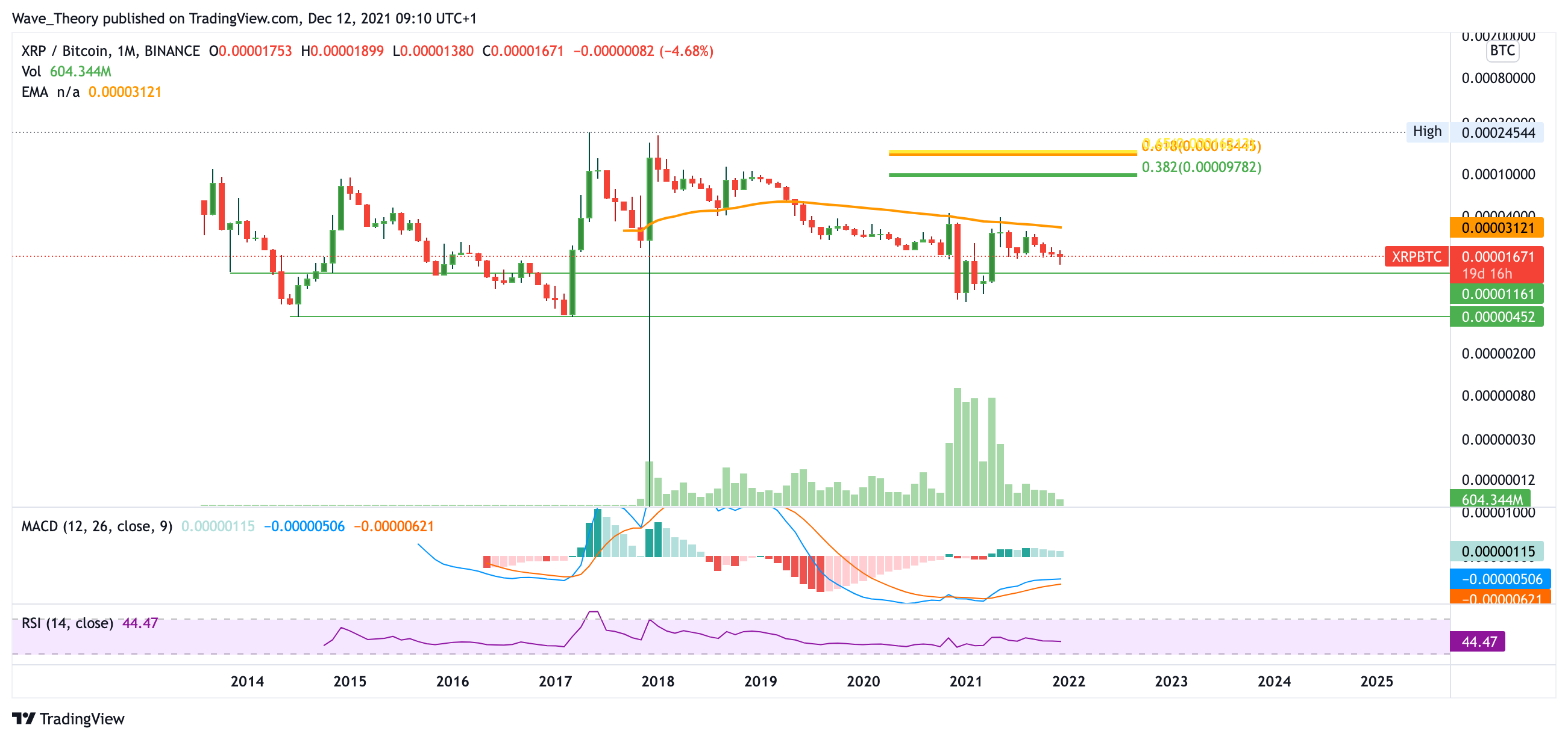 Gegen BTC erreichte der XRP Kurs vor einigen Monaten die Unterstützungszone zwischen 0,00000452 – 0,0000116 BTC. Dort prallte Ripple sehr stark ab, was mit einem massiven Anstieg des Handelsvolumens einherging. Jedoch wurde Ripple anschließend am 50-Monate-EMA abgewiesen, woraufhin sich Ripple aktuell zur Unterstützung zurückzubewegen scheint. Sollte es XRP zu einem späteren Zeitpunkt gelingen, den 50-Monate-EMA Widerstand zu brechen, findet er bei 0,00009782 BTC seinen nächsten signifikanten Widerstand.