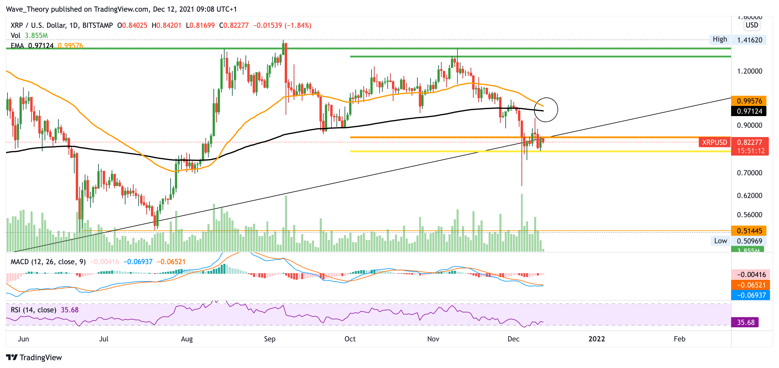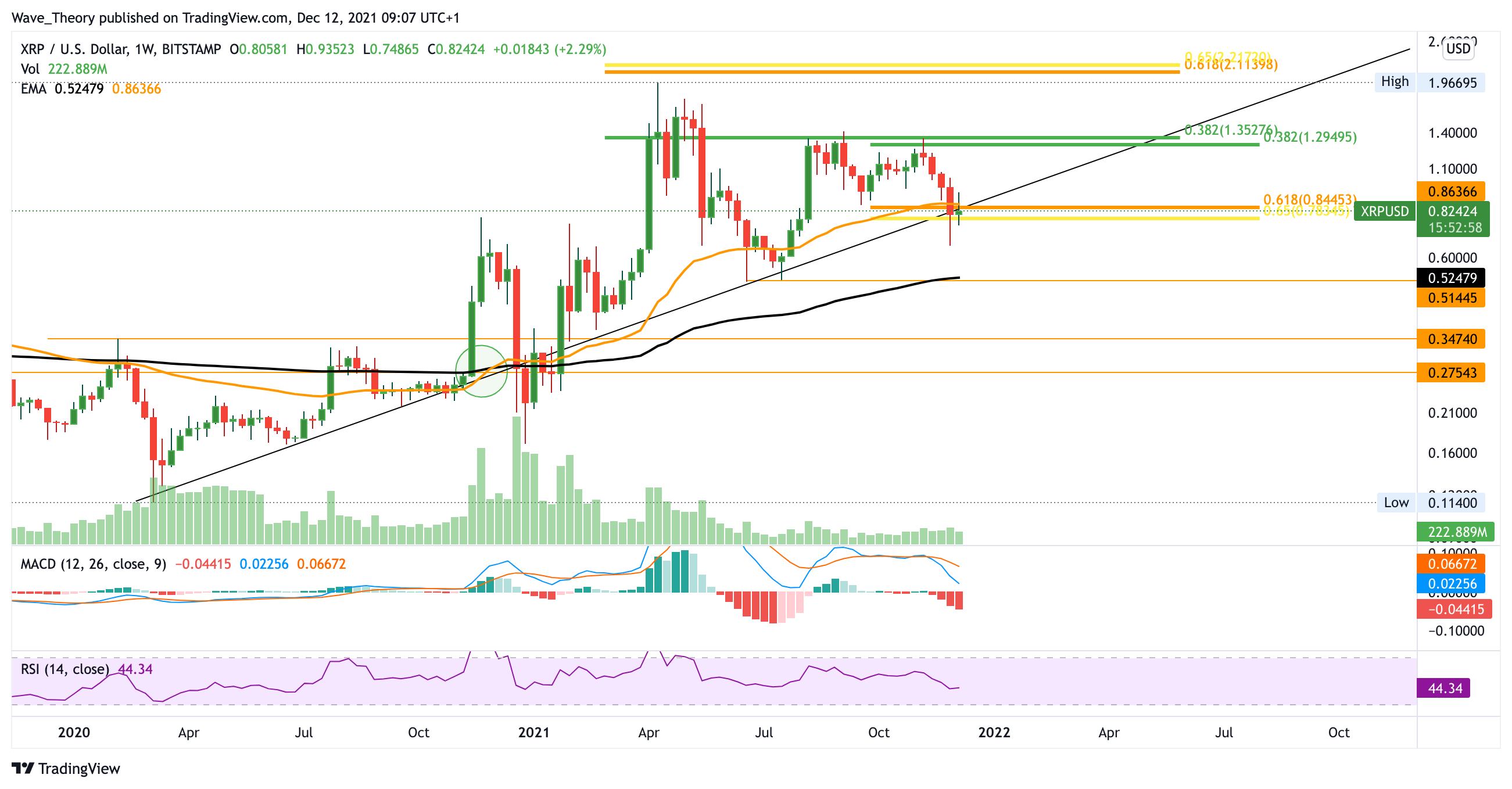 Diese Trendlinie verläuft durch die wichtige Golden Ratio Unterstützung, welche bei 0,85 USD liegt. Sollte der Ripple Kurs daran jetzt stark abprallen, könnte der Ripple Preis erneut 1,3 USD erreichen, wo er auf den 0,382 Fib Widerstand stößt. Jedoch zeigt sich der MACD im Wochenkurs sehr bärisch, was eine Fortsetzung der Abwärtsbewegung signalisiert. Sollte Ripple durch die aktuelle Unterstützung brechen, findet er am 200-Tage-EMA bei 0,525 USD erneut starke Unterstützung.