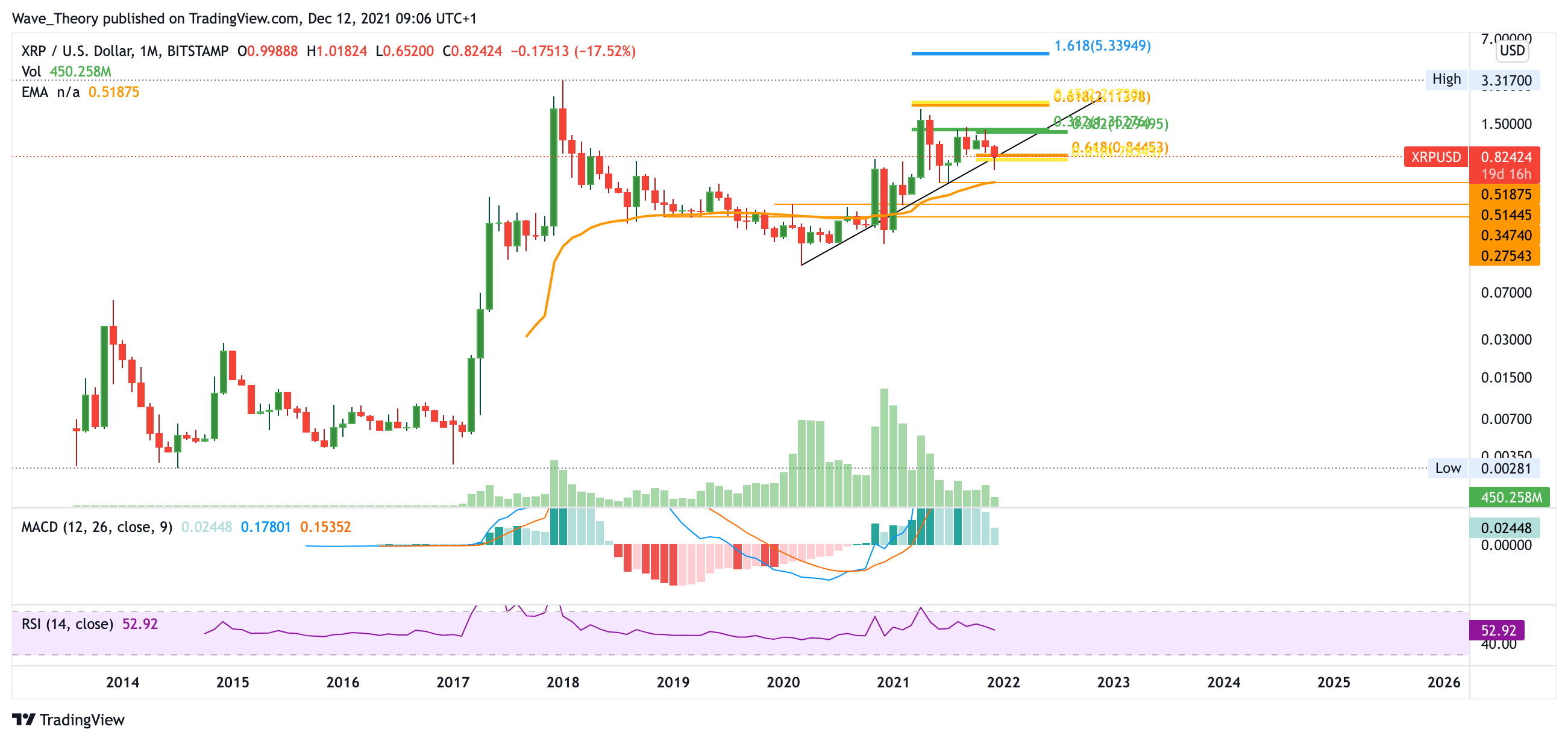 Zuvor wurde der Ripple Kurs an der Golden Ratio bei 2,1 USD abgewiesen, woraufhin der XRP Preis bis rund 0,52 USD korrigierte. Genau dort befindet sich aktuell der 50-Monate-EMA. Anschließend konnte Ripple bis zum nächsten Fib Widerstand bei rund 1,3 USD steigen, wo er erneut auf Ablehnung stieß. Damit befindet sich der XRP Kurs aktuell an einer Trendlinienunterstützung.