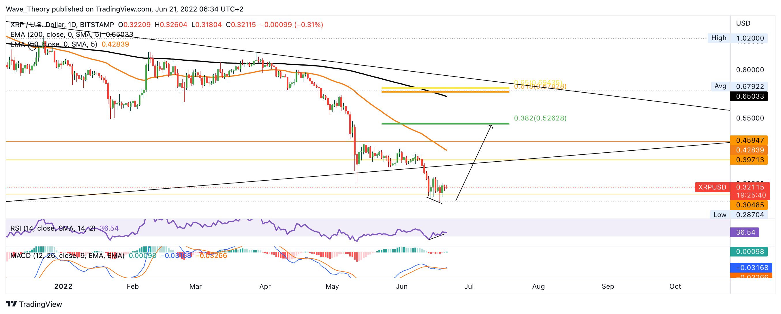 Der Ripple Kurs weist eine bullische Divergenz im RSI im Tageschart auf. Die bullische Divergenz formte sich, nachdem der Ripple Kurs die Unterstützung bei rund 0,3 USD erreicht hatte. Sollte XRP jetzt abprallen können, findet er bereits zwischen 0,4 – 0,46 USD horizontalen Widerstand, aber erst bei rund 0,53 USD signifikanten Fibonacci Widerstand.