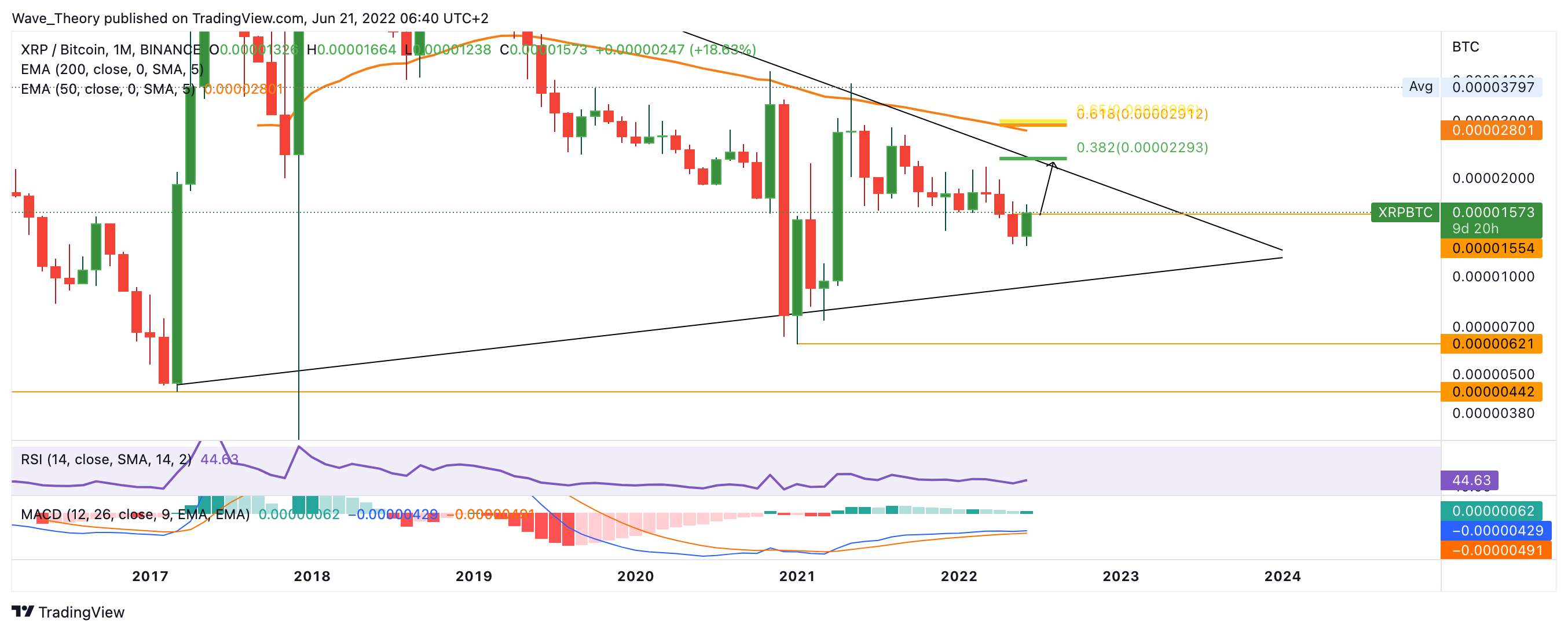 Etwas höher, bei rund 0,000029 BTC, stößt der XRP Kurs auf signifikanten Widerstand an der Golden Ratio und dem 50-Monate-EMA.
