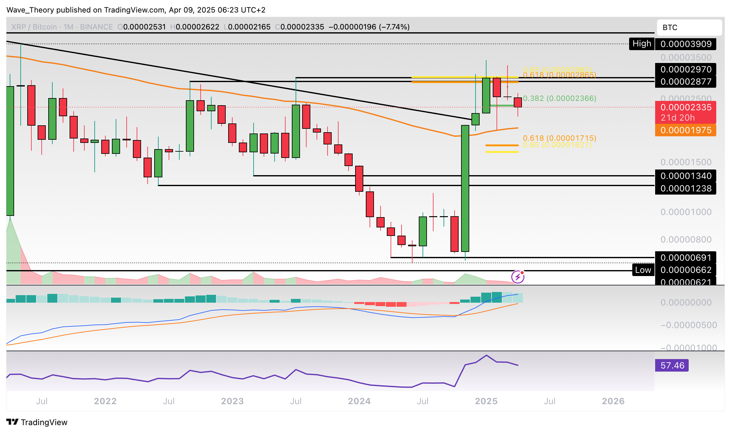 Gegen Bitcoin wurde der XRP Kurs die letzten drei Monate am Golden Ratio Widerstand bei rund 0,000029 BTC bärisch abgewiesen. Damit befindet sich Ripple jetzt an der 0,382 Fib Unterstützung bei rund 0,00002366 BTC.