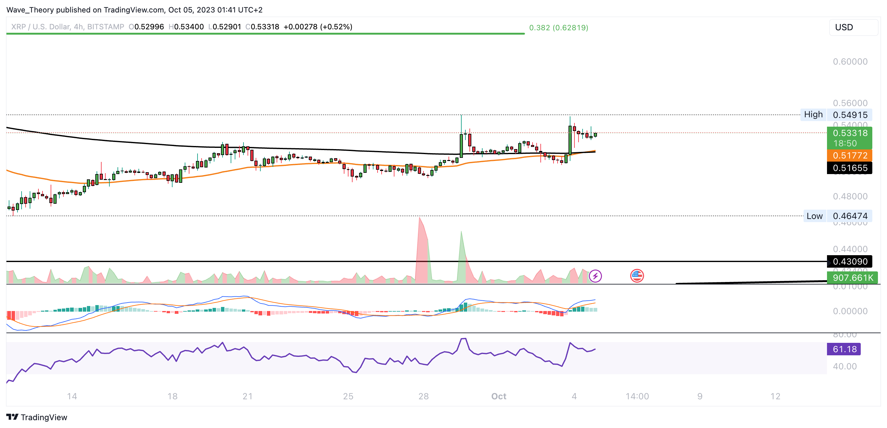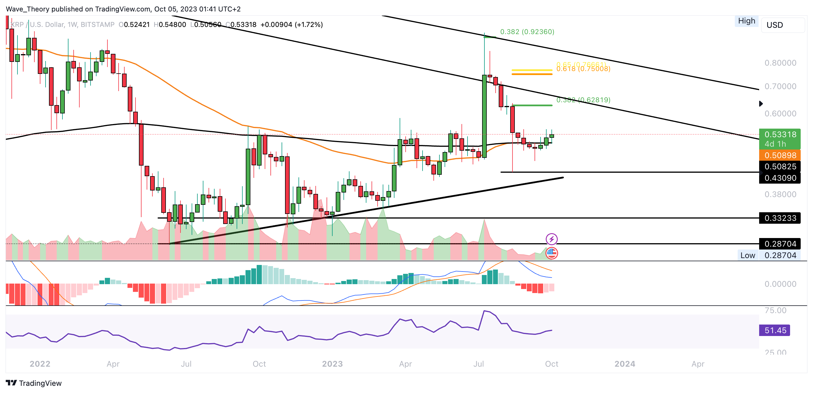 Wenn der Ripple Kurs weitersteigt, stößt er spätestens bei rund 0,628 USD auf signifikanten Fibonacci Widerstand. Nach unten hin wartet spätestens bei rund 0,43 USD signifikante Unterstützung auf Ripple.