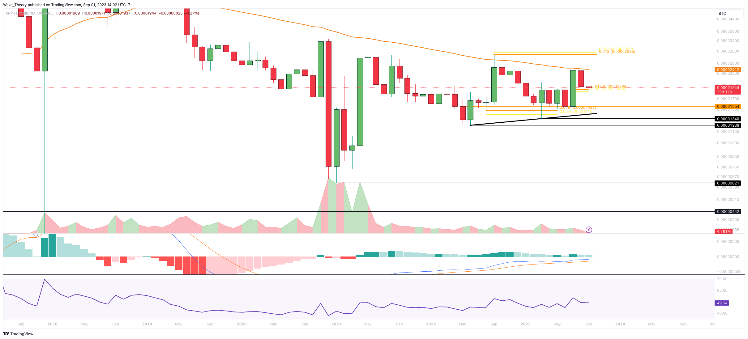 Gegen BTC wurde XRP letzten Monat am 50-Monate-EMA Widerstand bei rund 0,00002412 BTC bärisch abgewiesen. Im Monat zuvor wurde Ripple am Golden Ratio Widerstand bei rund 0,000029 BTC abgewiesen. Der Abwärtstrend ist also intakt.