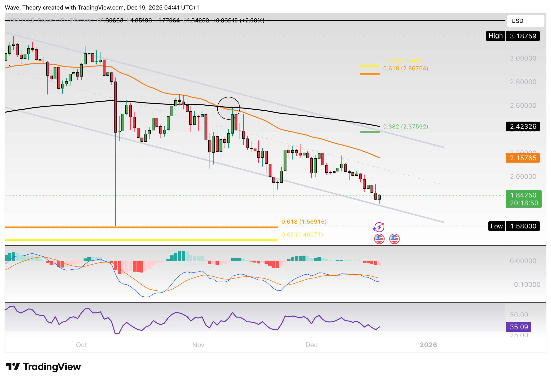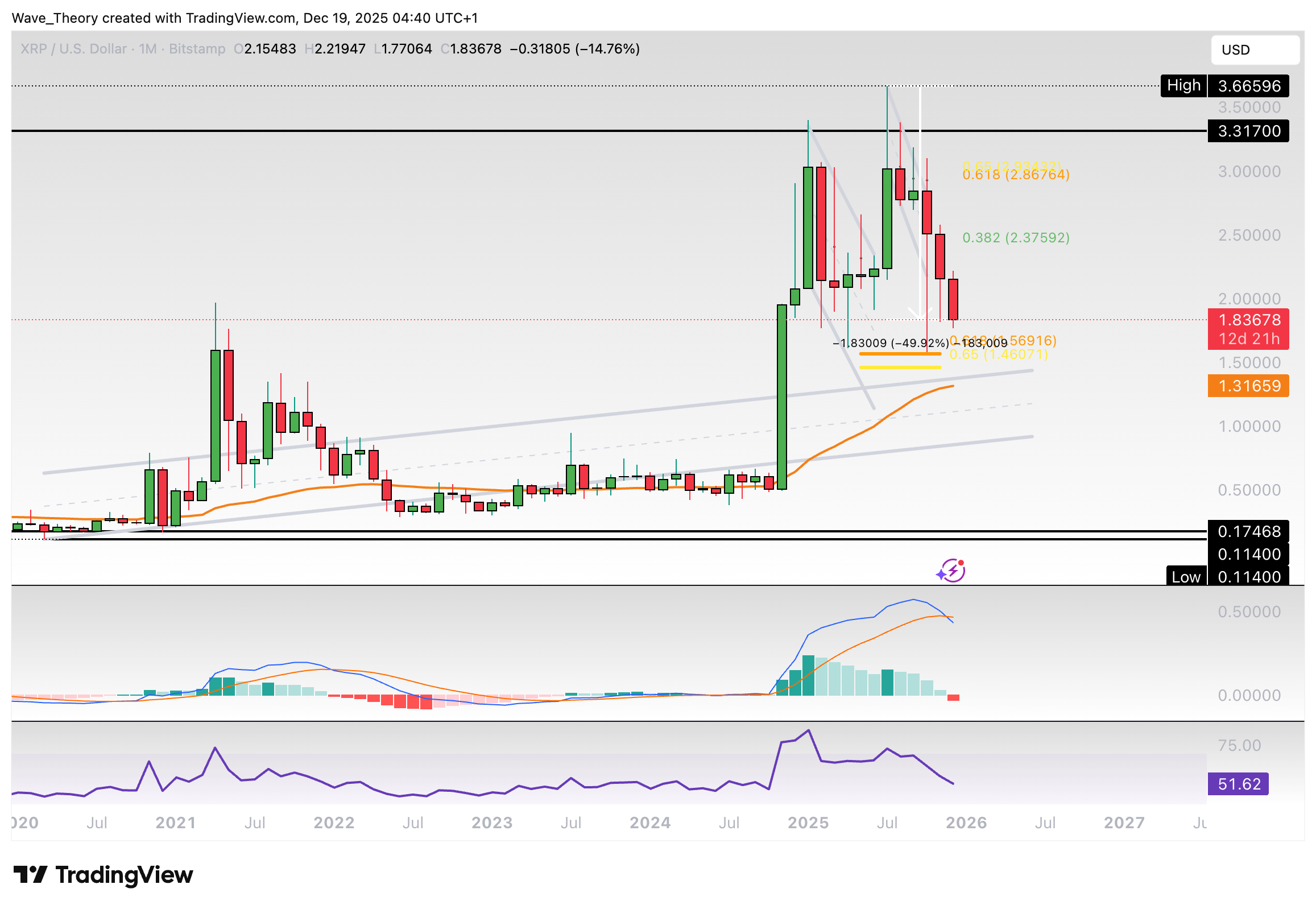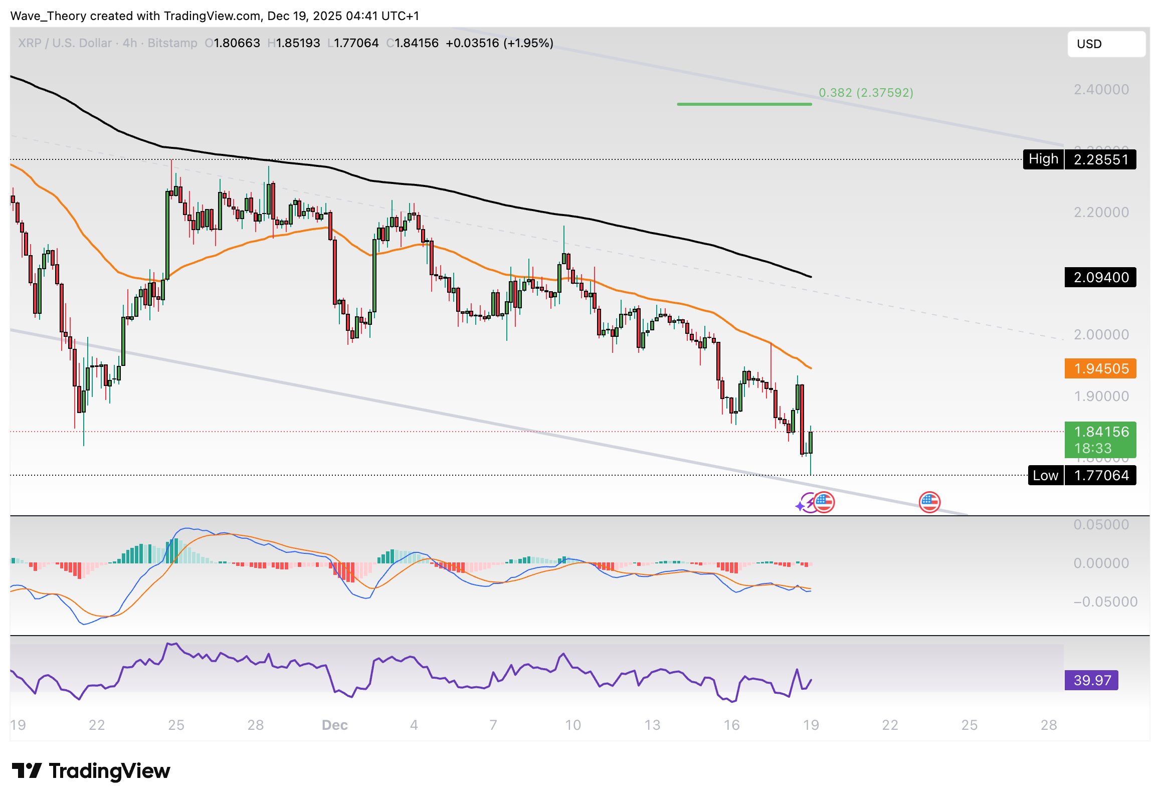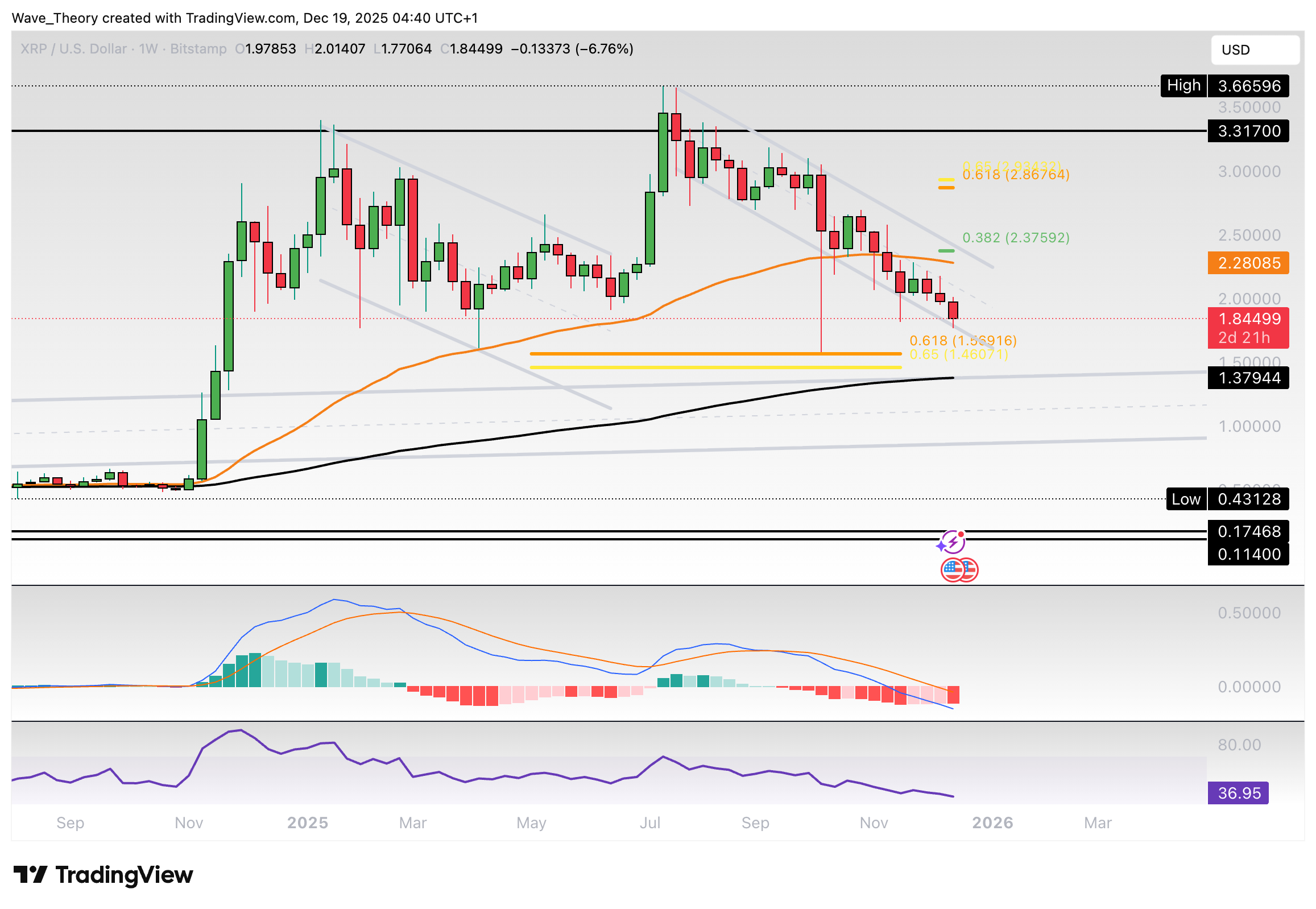 Der Ripple Kurs befindet sich in einem parallelen Abwärtskanal. Nach oben hin wartet bereits am 50-Wochen-EMA bei rund 2,3 USD signifikanter Widerstand. Darüber hinaus liegen bei rund 2,38 USD und 2,9 USD signifikante Fibonacci Widerstände.