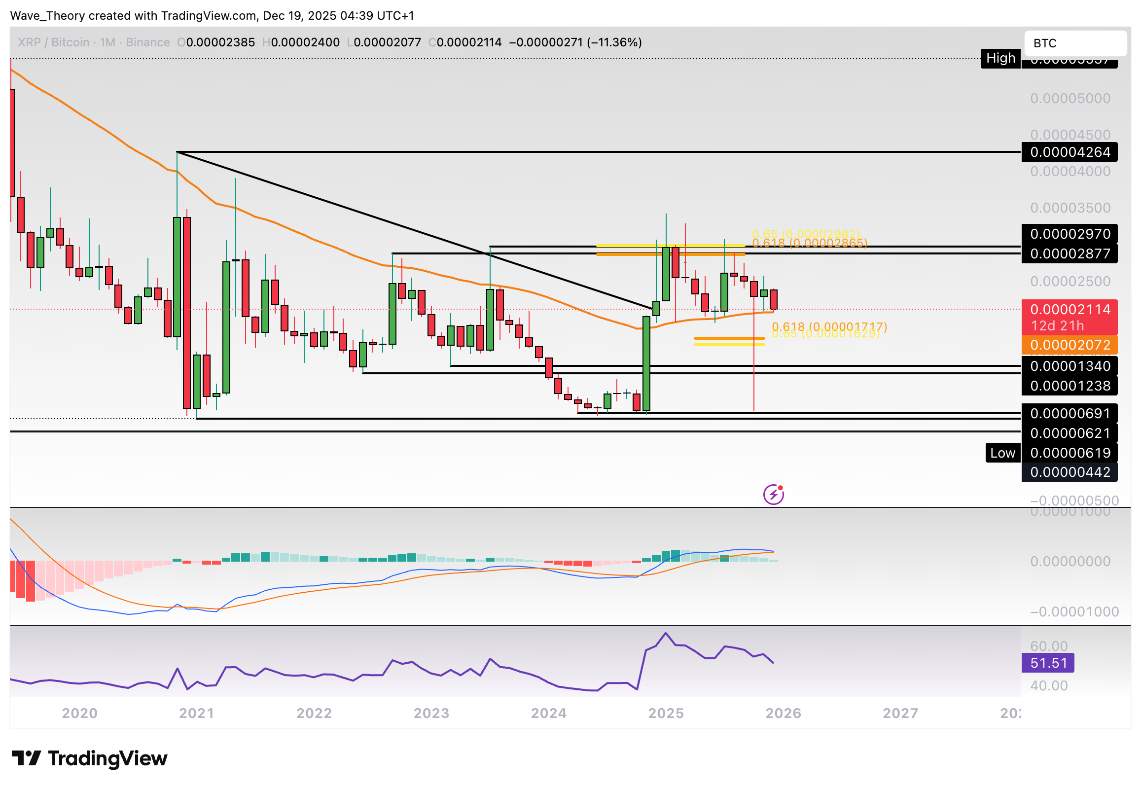 Nach oben hin wartet nach wie vor am Golden Ratio Niveau bei rund 0,0000288 BTC signifikanter Fib Widerstand, woran der Kurs zuvor mehrfach bärisch abgewiesen wurde. Die Indikatoren geben dabei bärische Signale im Monatschart.