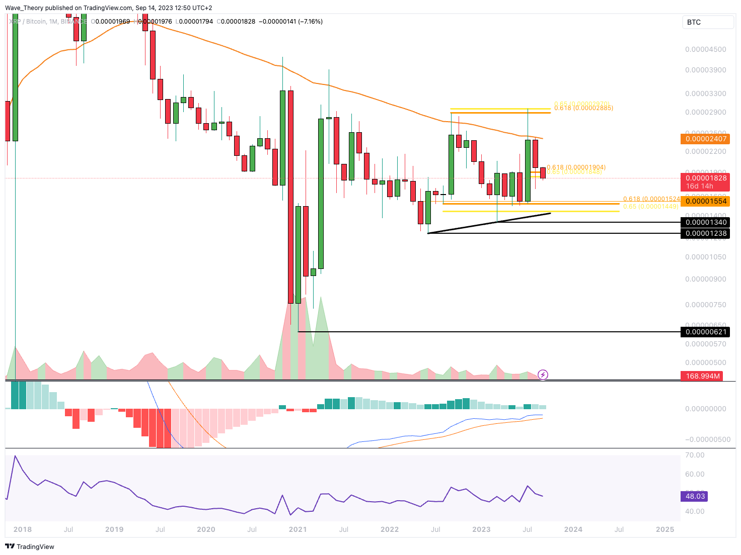 Gegen BTC könnte der XRP Kurs jetzt zur Golden Ratio Unterstützung bei rund 0,000015 BTC korrigieren