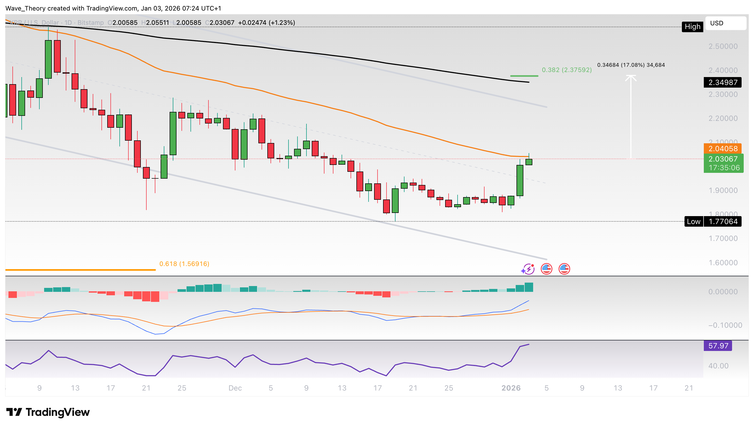 Der RSI bewegt sich dabei in neutralem Gebiet. Derzeit stößt Ripple am 50-Tage-EMA bei rund 2,04 USD auf signifikanten Widerstand. Bricht Ripple diesen, könnte der Kurs zum 200-Tage-EMA am 0,382 Fib Niveau bei rund 2,376 USD steigen.