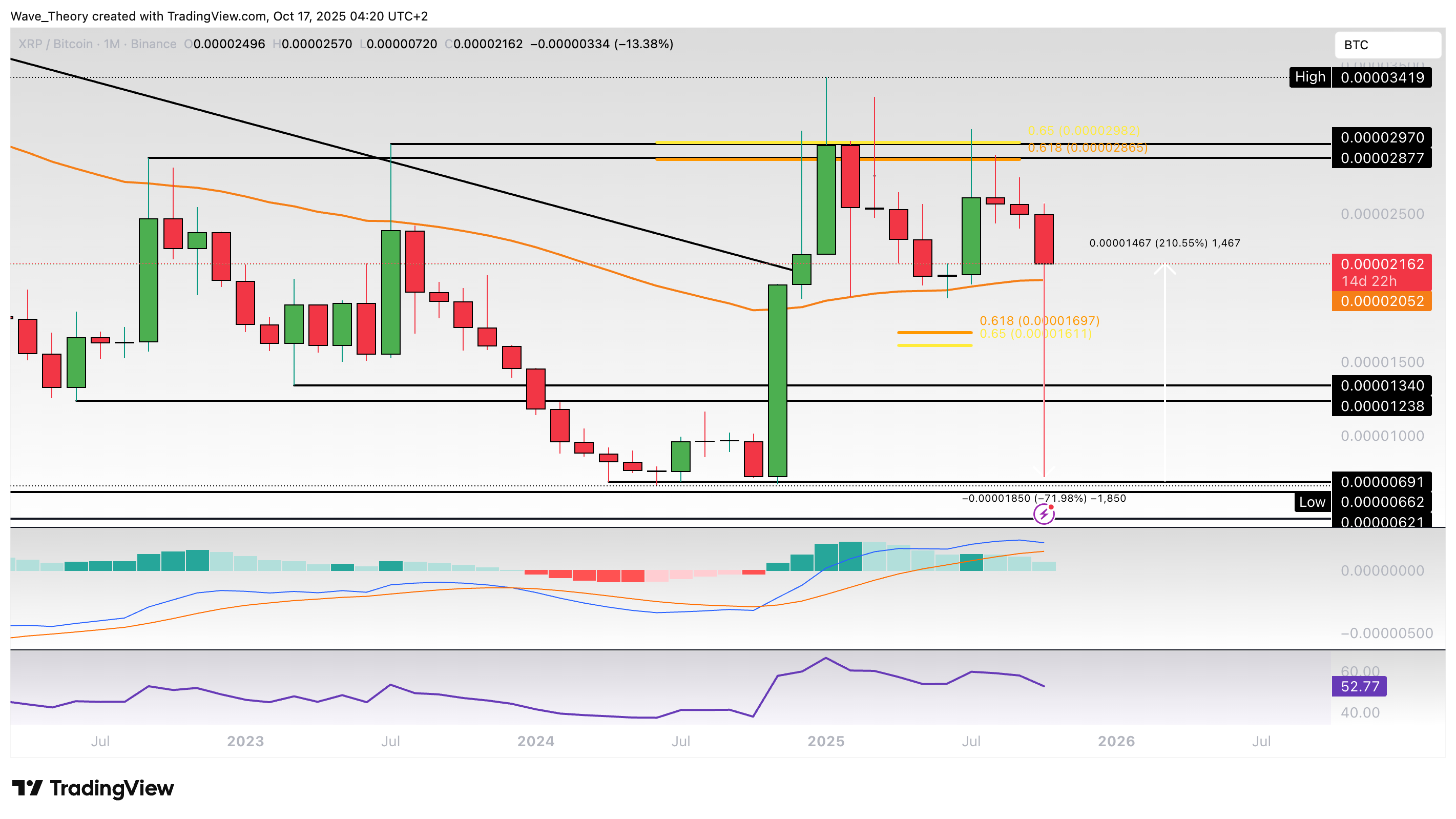 Gegen Bitcoin ist Ripple nach der bärischen Abweisung am Golden Ratio Widerstand bei rund 0,000029 BTC zunächst rund 72 % gefallen, um annähernd die Unterstützungszone zwischen rund 0,0000062 BTC und 0,00000691 BTC zu erreichen.