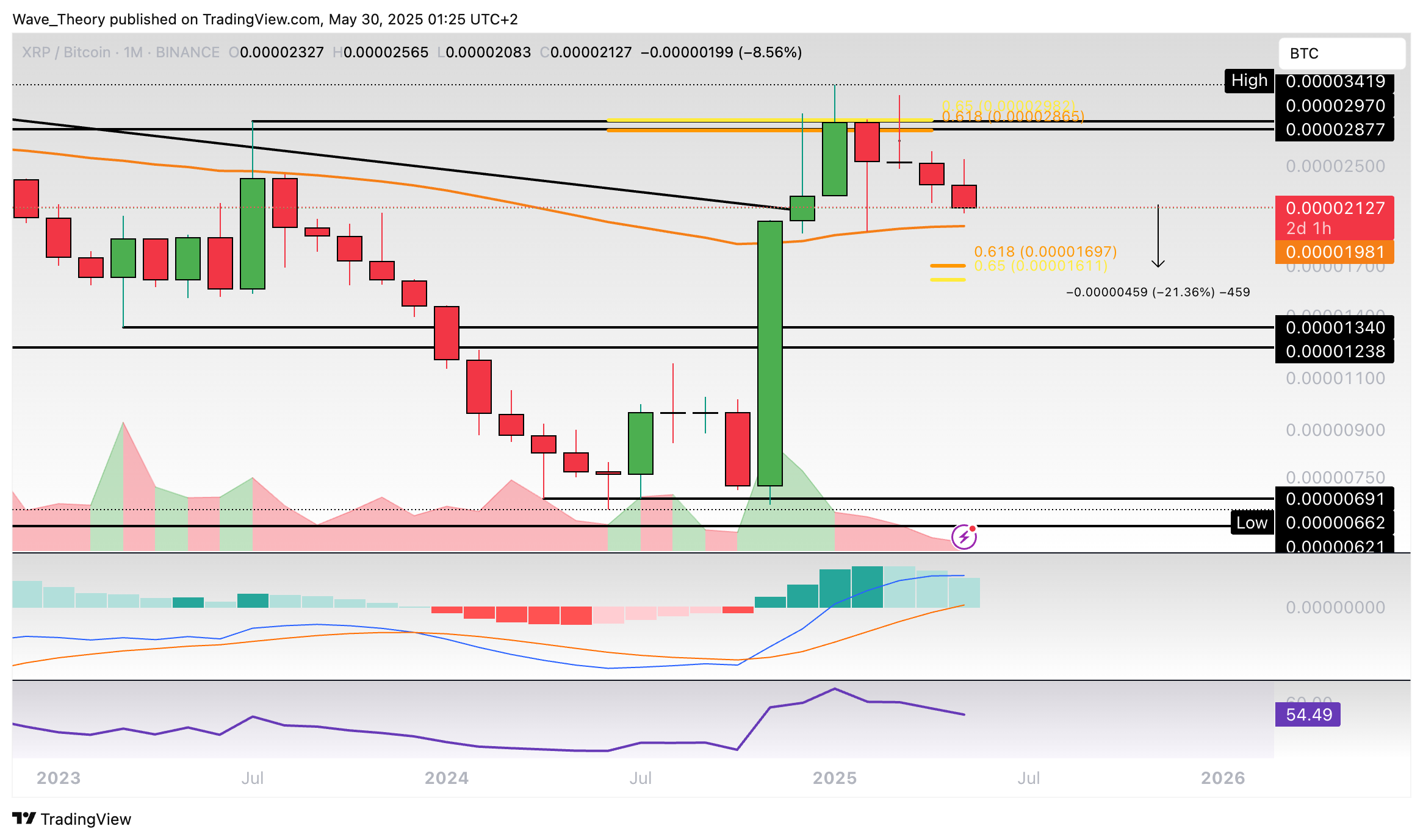 Gegen Bitcoin wurde Ripple vor vier Monaten am Golden Ratio Widerstand bei rund 0,000029 BTC bärisch abgewiesen und bewegt sich seither in Richtung 50-Monate-EMA.