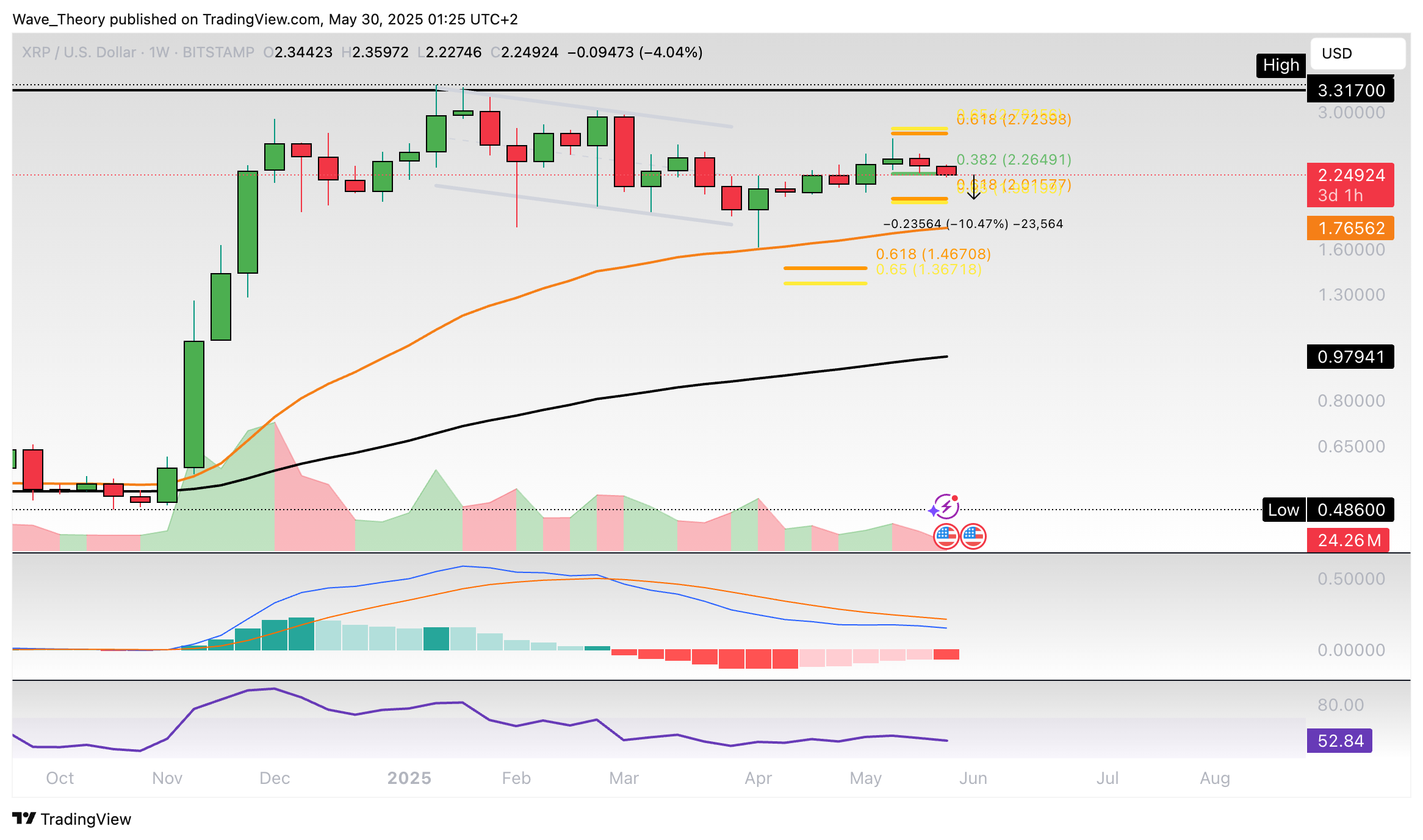 Im Wochenchart wird ersichtlich, dass es Ripple nicht gelungen ist, den Golden Ratio Widerstand bei rund 2,75 USD zu überwinden. Damit bleibt die Korrekturphase intakt.