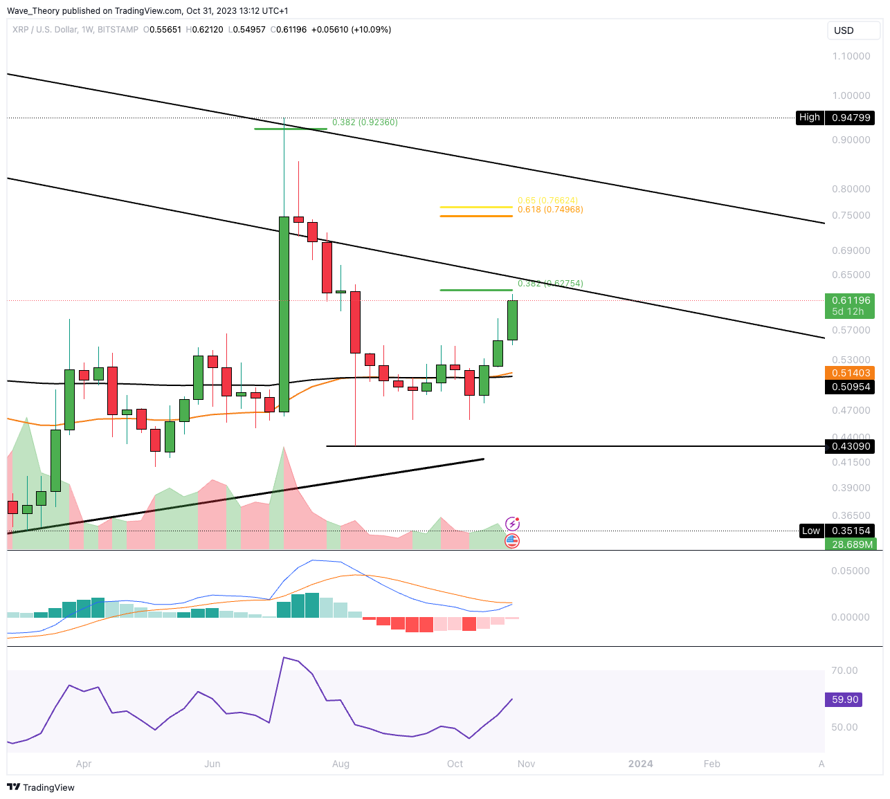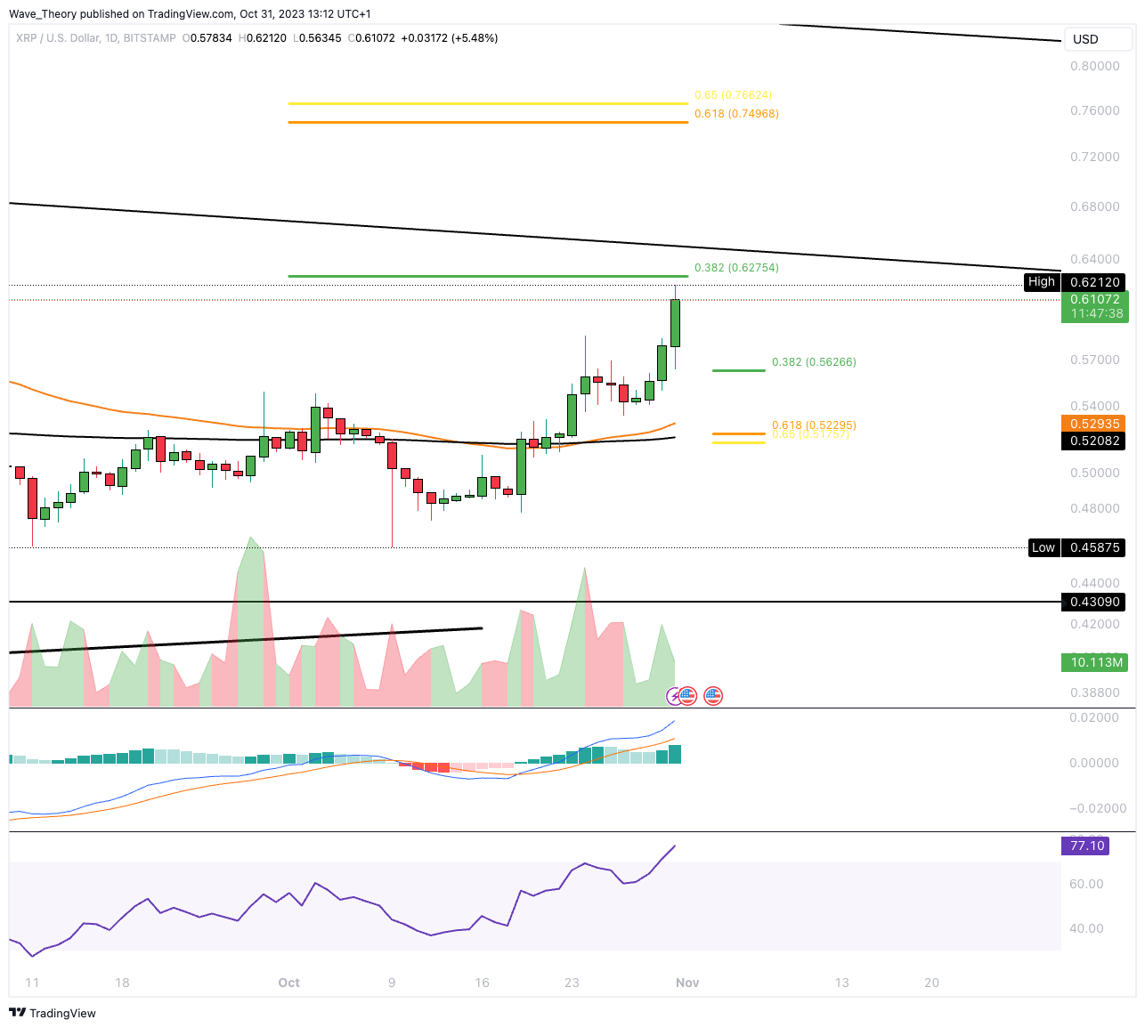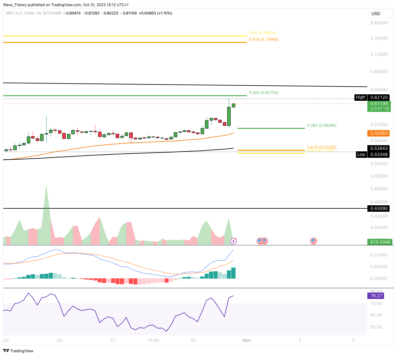 Der RSI erreicht hingegen überkaufte Regionen, weist dabei aber keine bärische Divergenz auf. Wenn XRP den 0,382 Fib Widerstand bricht, könnte Ripple bis zur Golden Ratio bei rund 0,75 USD steigen.