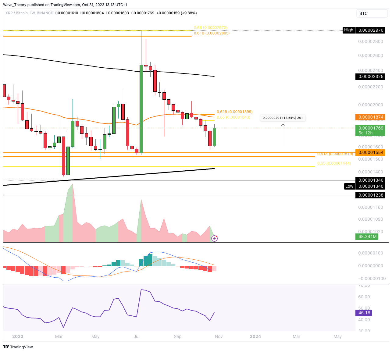 Gegen Bitcoin stößt der Ripple Kurs an der Golden Ratio bei rund 0,0000145 BTC auf signifikante Unterstützung. Dort könnte der Kurs bullisch abprallen.