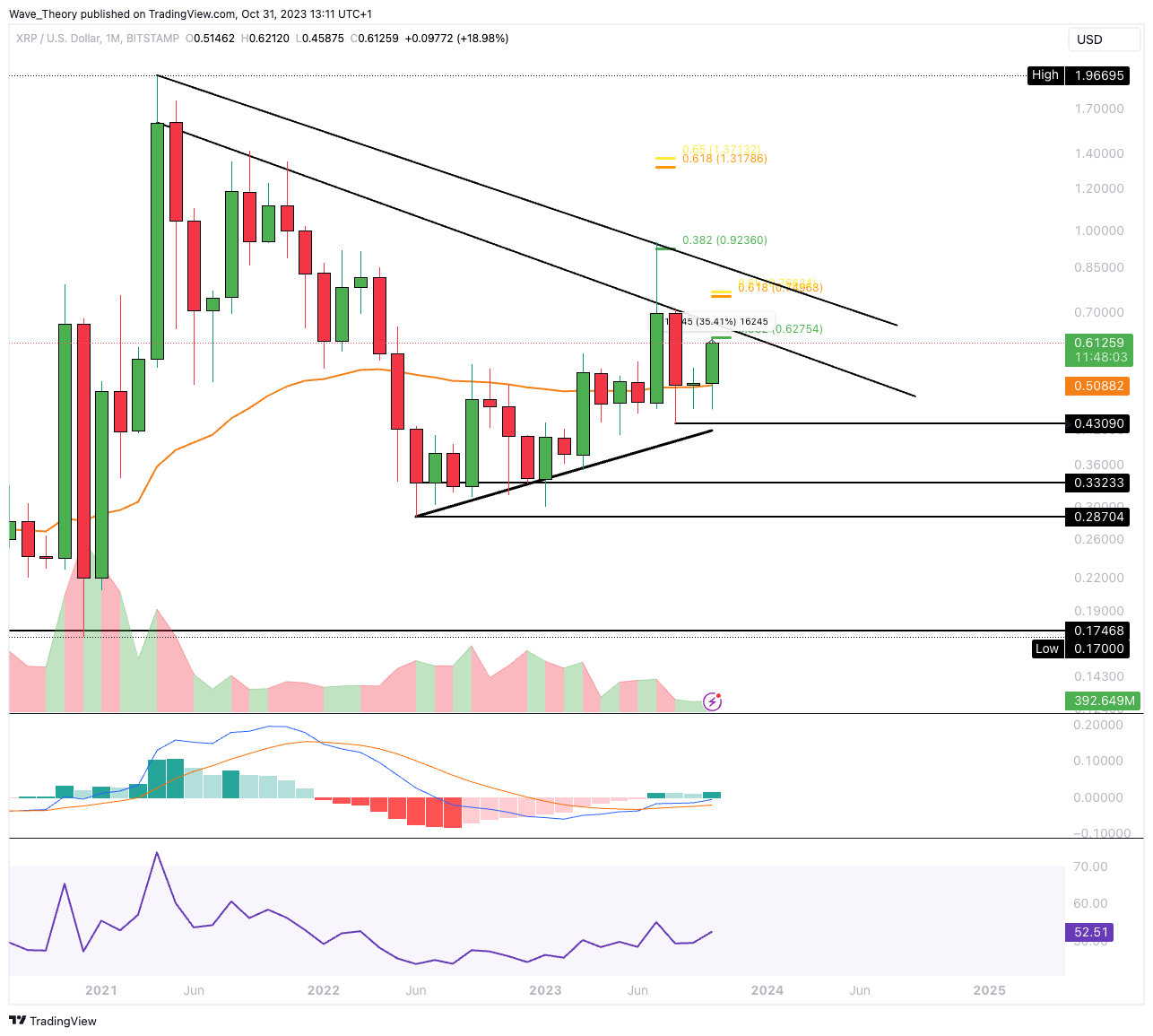 Der Ripple Kurs konnte in diesem Monat an der 50-Monate-EMA Unterstützung an der 0,5 US-Dollar Marke abprallen und in Zuge dessen über 35 % steigen. Damit tickt auch das Histogramm des MACDs in diesem Monat wieder bullisch höher.