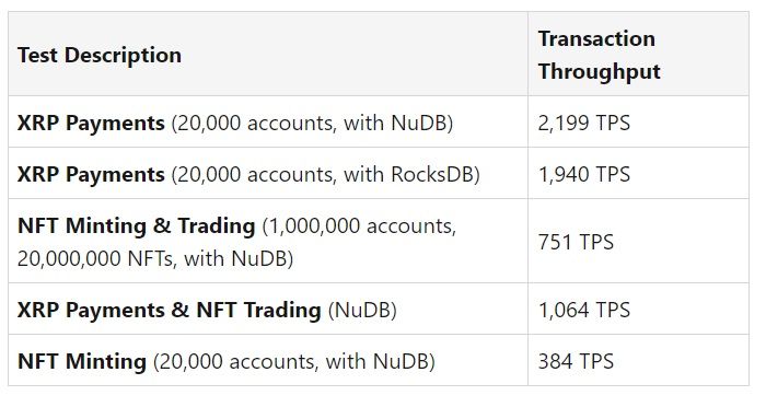 Angefangen vom Minting (der Erstellung der NFTs) bis zum Handel werden sowohl bei Ethereum als auch XRP mehrere Transaktionen benötigt. Ein Ripplexdev-Team aus San Francisco testete die für den NFT-Handel notwendigen Funktionen für XRP erfolgreich. Bei der Testphase konnten für 20.000 Accounts rund 2000 Trades pro Sekunde verarbeitet werden, währen diese Zahl für das Minting bei rund 350 lag. Insgesamt mintete das Team 20 Millionen NFTs.