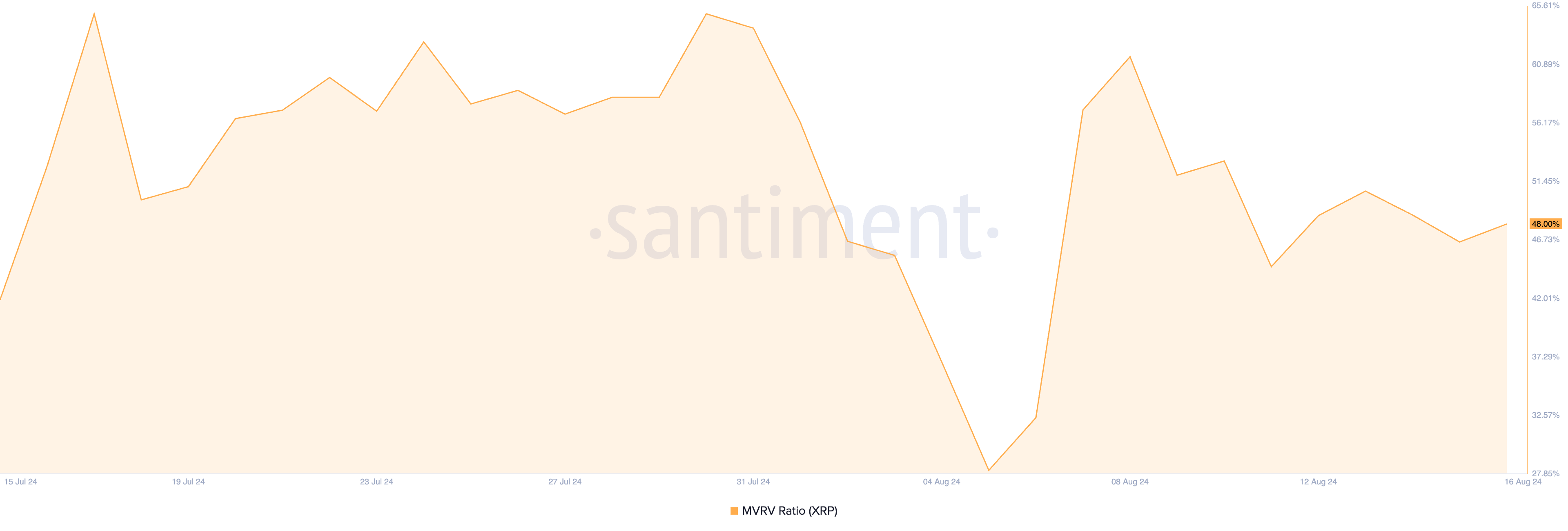 Die Messungen des Verhältnisses von Marktwert zu realisiertem Wert (MVRV) von XRP zeigen, dass der Altcoin derzeit überbewertet ist. Zum Zeitpunkt dieses Schreibens liegt das MVRV-Verhältnis des Coins bei 48 Prozent.