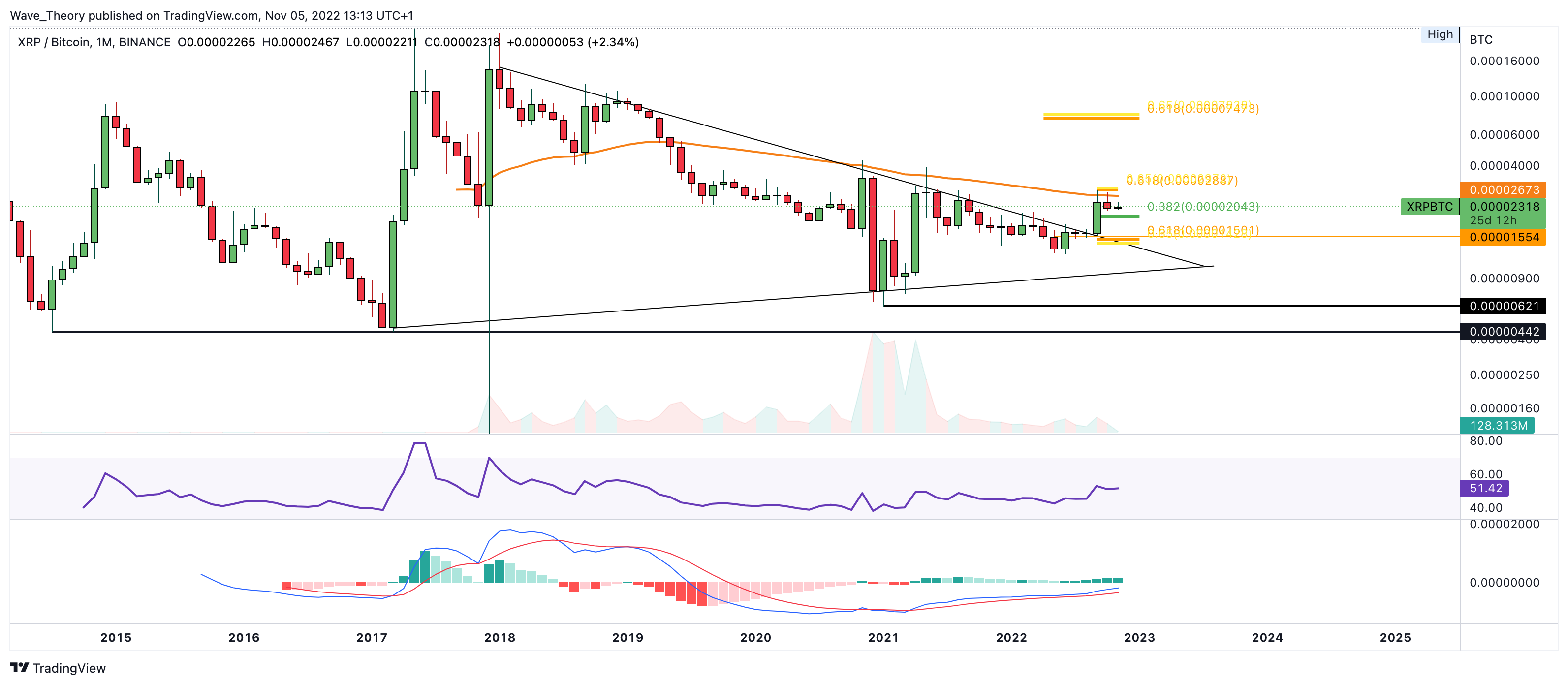 XRP könnte in diesem Monat zum 0,382 Fib Niveau bei rund 0,0000204 BTC oder gar bis zur Golden Ratio Unterstützung bei rund 0,000015 BTC korrigieren, um daran stark abzuprallen und die Aufwärtsbewegung fortzusetzen.