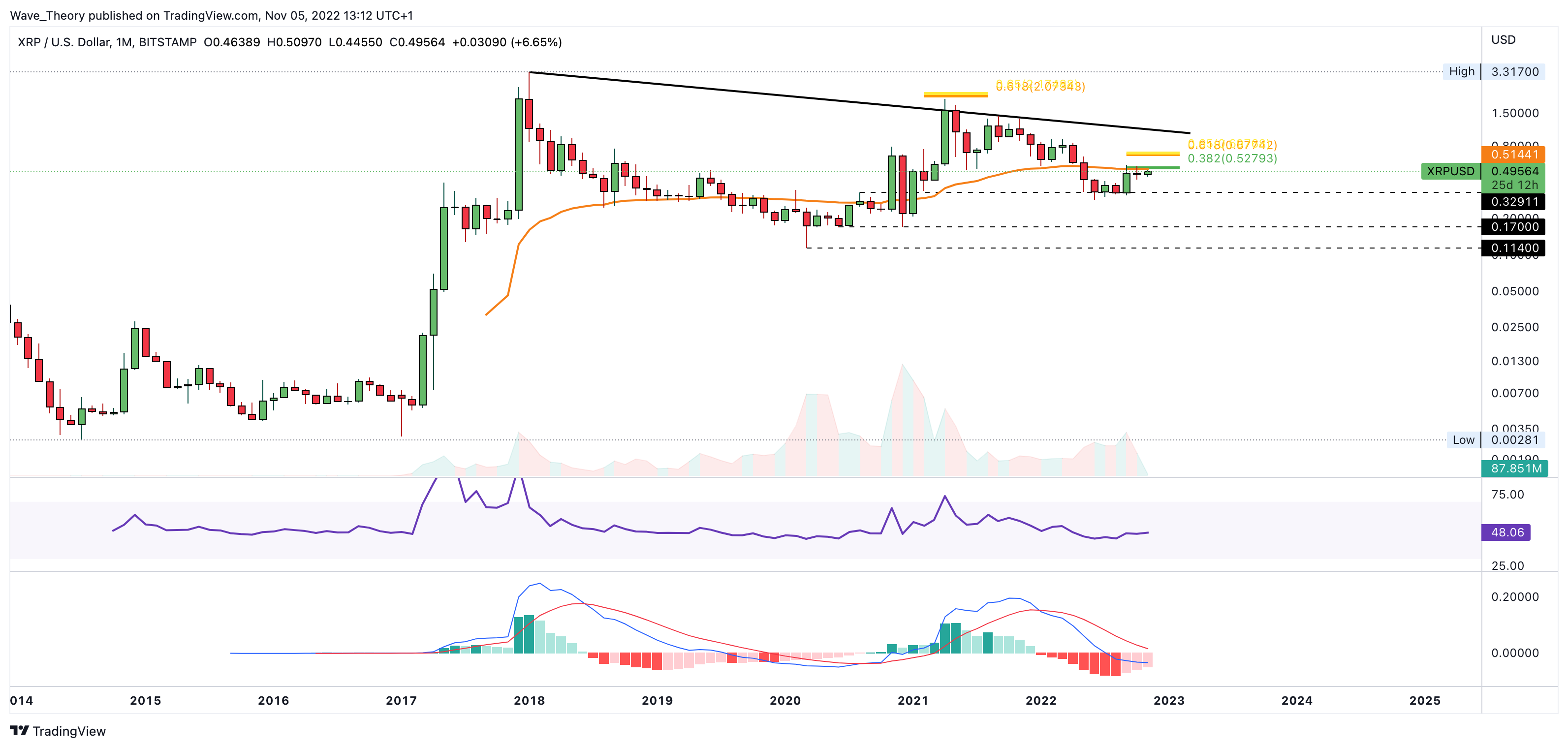 Im Gegensatz zum Wochenchart zeigt sich das Histogramm des MACDs im Monatschart eindeutig bullisch, denn es tickt bereits den dritten Monat in Folge bullisch höher. Knapp unter dem 0,382 Fib Niveau bei rund 0,529 USD befindet sich zudem der 50-Monate-EMA Widerstand. Ein Bruch wäre sehr bullisch für Ripple.