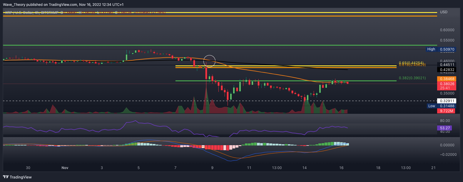 Daraufhin kehrte XRP erneut zur Unterstützung bei rund 0,33 USD zurück, prallte daran ab und stieg erneut zum Fib Widerstand bei rund 0,39 USD. Dort scheint XRP heute erneut bärisch abgewiesen zu werden.