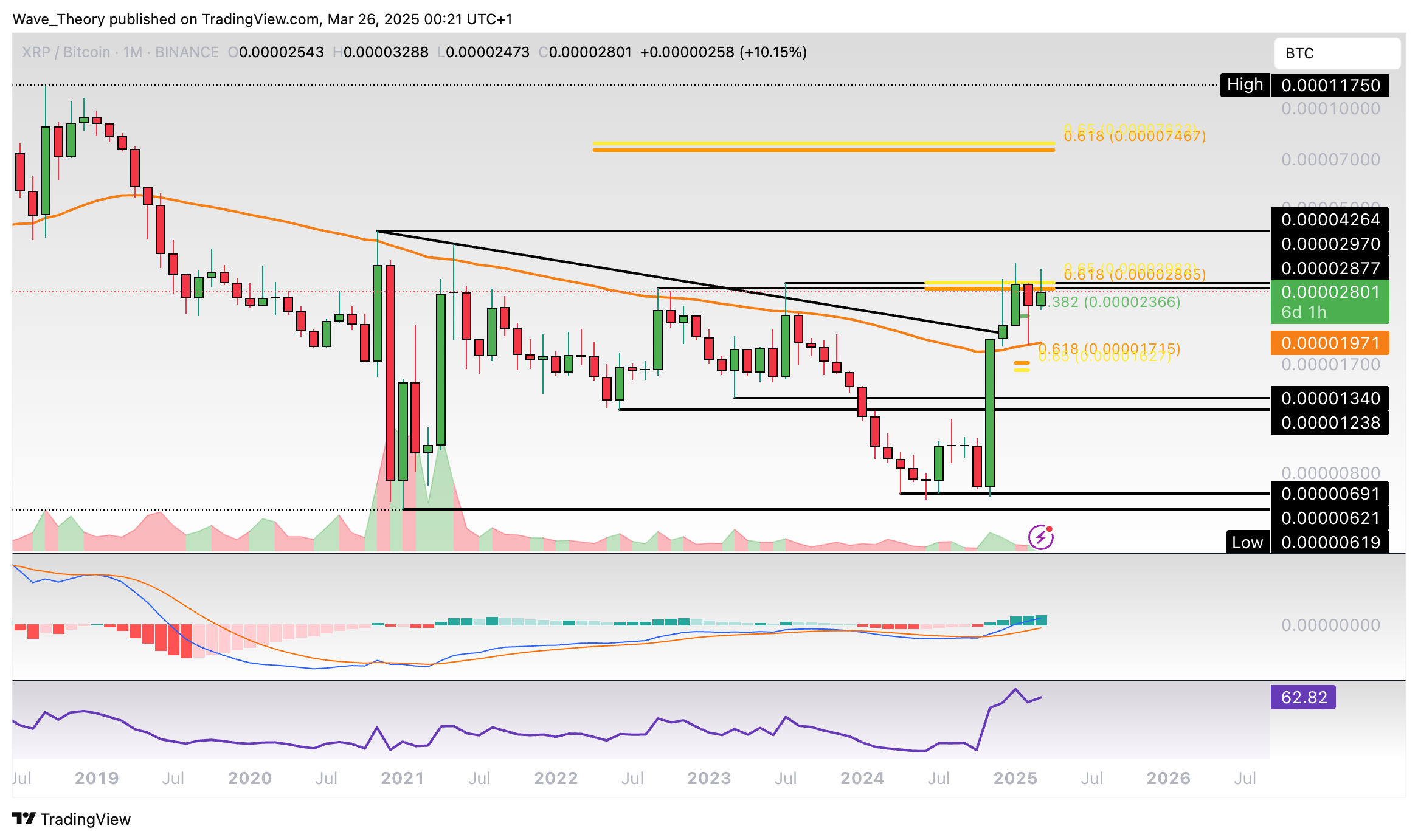 Gegen Bitcoin befindet sich der XRP Kurs jetzt wieder am Golden Ratio Widerstand bei rund 0,000029 BTC, nachdem der Kurs letzten Monat am 50-Monate-EMA bei rund 0,0000197 BTC abprallen konnte.